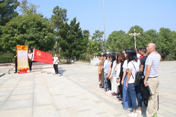 15日上午7点30分,全体人员乘大巴从学校前往荆州市洪湖革命烈士陵园,三个多小时的车程,在一路交流谈心中很快到达了目的地。邱宝生书记和党政服务中心徐佑发主任亲自带队,带领大家进入烈士陵园向烈士们敬献花篮、缅怀先烈。随后全体党员向党旗宣誓。