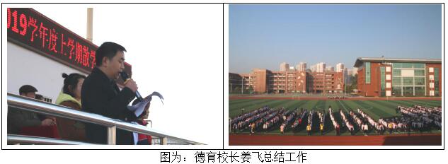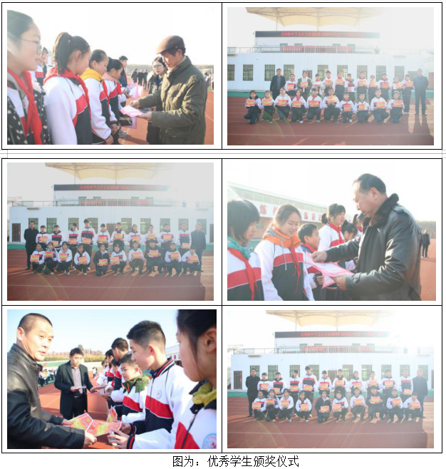 散学典礼由团委书记高义千主持。活动开始,全体师生面向国旗,举行升旗仪式。随后德育校长姜飞就本学期教育教学工作进行全面总结。他代表学校向全体辛勤劳动、无私奉献的老师表示衷心的感谢!向全体奋发向上、积极进取的同学表示热烈的祝贺!对于本学期来400多名师生取得的各项荣誉表示祝贺!希望同学们在假期要对学习进行总结反思、温故知新;要合理安排时间,积极参加体育锻炼,更要在家孝顺父母,做一个心怀感恩的人!最后也提醒大家:在享受幸福生活的同时,一定将安全牢记心中。