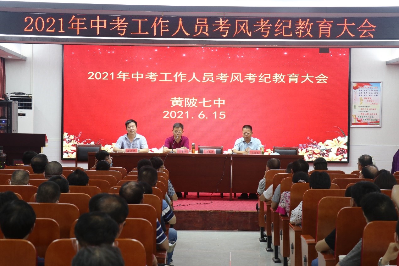 为进一步统一思想,提高认识,落实责任,严肃考风考纪,营造一个公平竞争的环境,确保 2021年中考组考工作的顺利进行,6 月 15 日晚 8点整,区七中召开 了 2021 年中考考风考纪教育大会,区教育局副局长江中华、局调研员陈塬乐出席会议并讲话,考点巡视员、全体监考教师和工作人员参加大会,接受了一次全面的、深刻的思想洗礼和纪律教育。