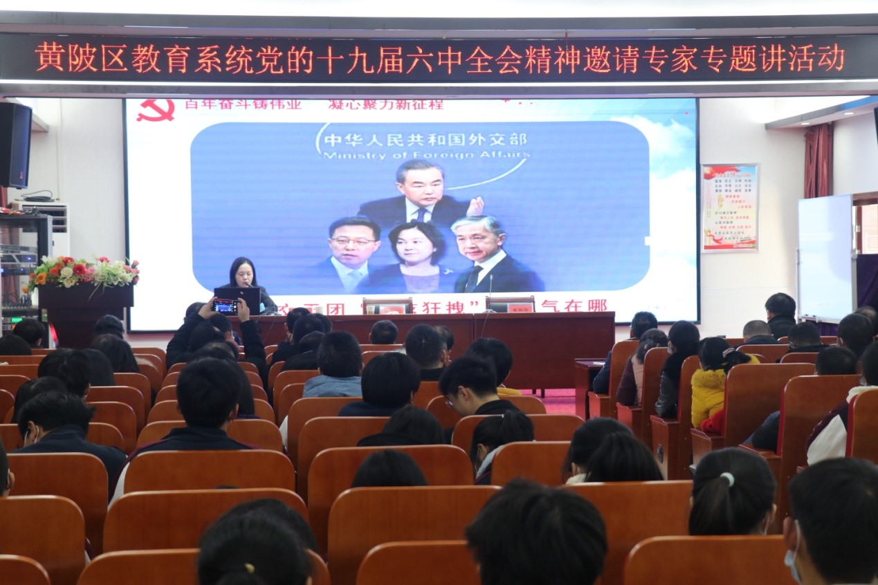 为深入学习贯彻党的十九届六中全会精神,落实市教育局党委、区委相关工作部署,12月29日上午9时整,黄陂七中综合楼六楼报告厅济济一堂,区教育系统党的十九届六中全会精神宣讲活动七中专场在这里举行。此次活动主讲人为市委宣讲团成员、黄陂一中教师胡珊,出席报告会的有区教育局二级调研员陈塬乐、局宣传科的相关领导、前川总支领导、前川地区各中小学分管副校长(或政教主任)和思政老师,以及区七中师生代表等。