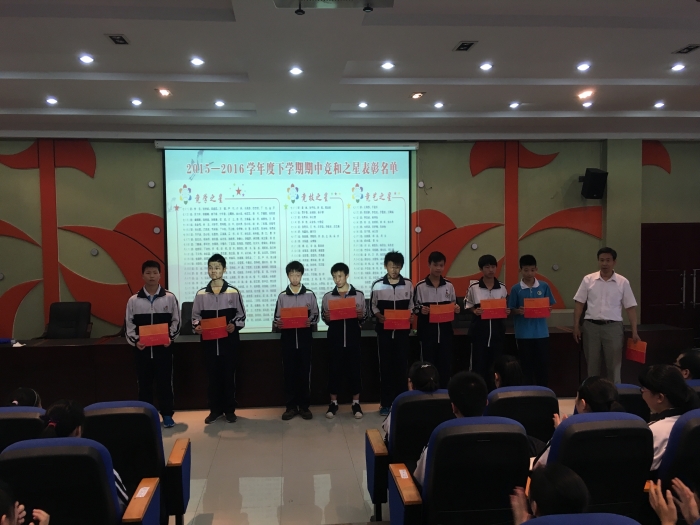 表彰大会由团委沈书记主持。首先,刘校长宣读了五四表彰获奖名单,陈校长和袁书记为获奖代表颁奖。随后,竞学之星、竞技之星及和谐之星的获得者代表八(6)班的张婷、八(2)班的彭富康和七(7)班的翟优扬同学分别发表了获奖感言。七(1)班的于孟仟等六名同学作为竞艺之星的代表表演了舞蹈《青春修炼手册》,赢得了老师和同学们阵阵掌声。新团员代表面对团旗庄严的宣誓,陈校长和袁书记亲自为新团员代表佩戴团徽,并集体合唱团歌《光荣啊!中国共青团》。最后,袁书记对本次大会作了总结并对同学们提出了希望和要求。