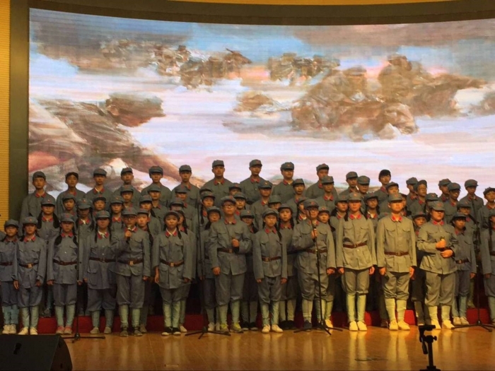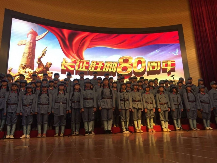 9月28日,同学们在刘校长、熊主任、沈书记及政教处张老师的带领下穿着整齐的红军服来到了比赛会场。我们是最后一个压轴表演。表演以两名同学的朗诵《我爱这土地》开场,两名同学一个声音低沉一个声音高亢,形成了强烈对比,用两种不同而递进的情绪表达了对土地对祖国的热爱。这一首诗勾起了在场观众对抗战历史和那段峥嵘岁月的记忆与缅怀。接下来同学们以一首从轻柔到悲壮的《黄水谣》,唱出了抗战时老百姓痛苦的经历与悲愤的情感。紧接着,化悲愤为力量,由八名同学带来了慷慨激昂的朗诵《祖国啊,我亲爱的祖国!》,孩子们两两组合,刚柔并济抑扬顿挫,无比自豪的表达了对祖国深深的热爱。最后,全体学生大声齐诵:“祖国啊,我亲爱的祖国!”向祖国母亲67周年生日表达深情的祝福,将表演推向了高潮。