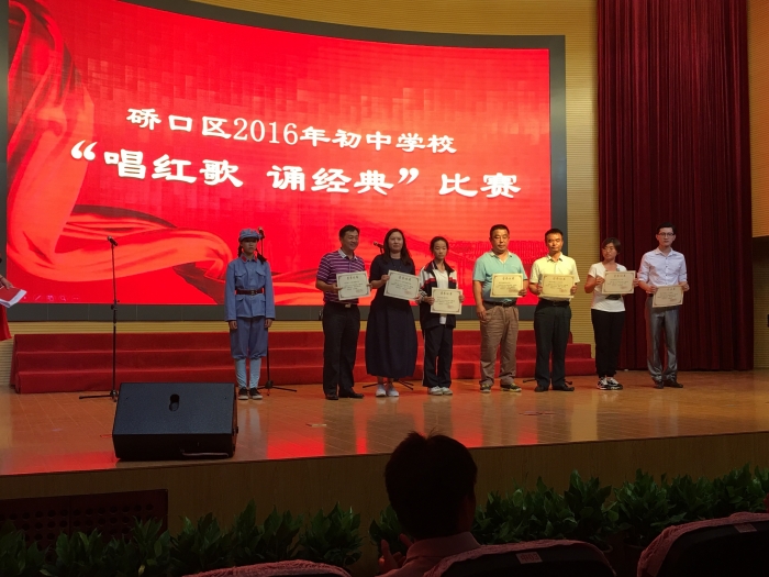 为纪念中华人民共和国成立67周年和中国工农红军长征胜利80周年,继承革命传统,弘扬先进文化,提升学生文化艺术修养,硚口区体卫艺站于2016年9月28日在武汉四中举办了初中“唱红歌•诵经典”比赛。我校组织70多名学生盛装参与了本次比赛。