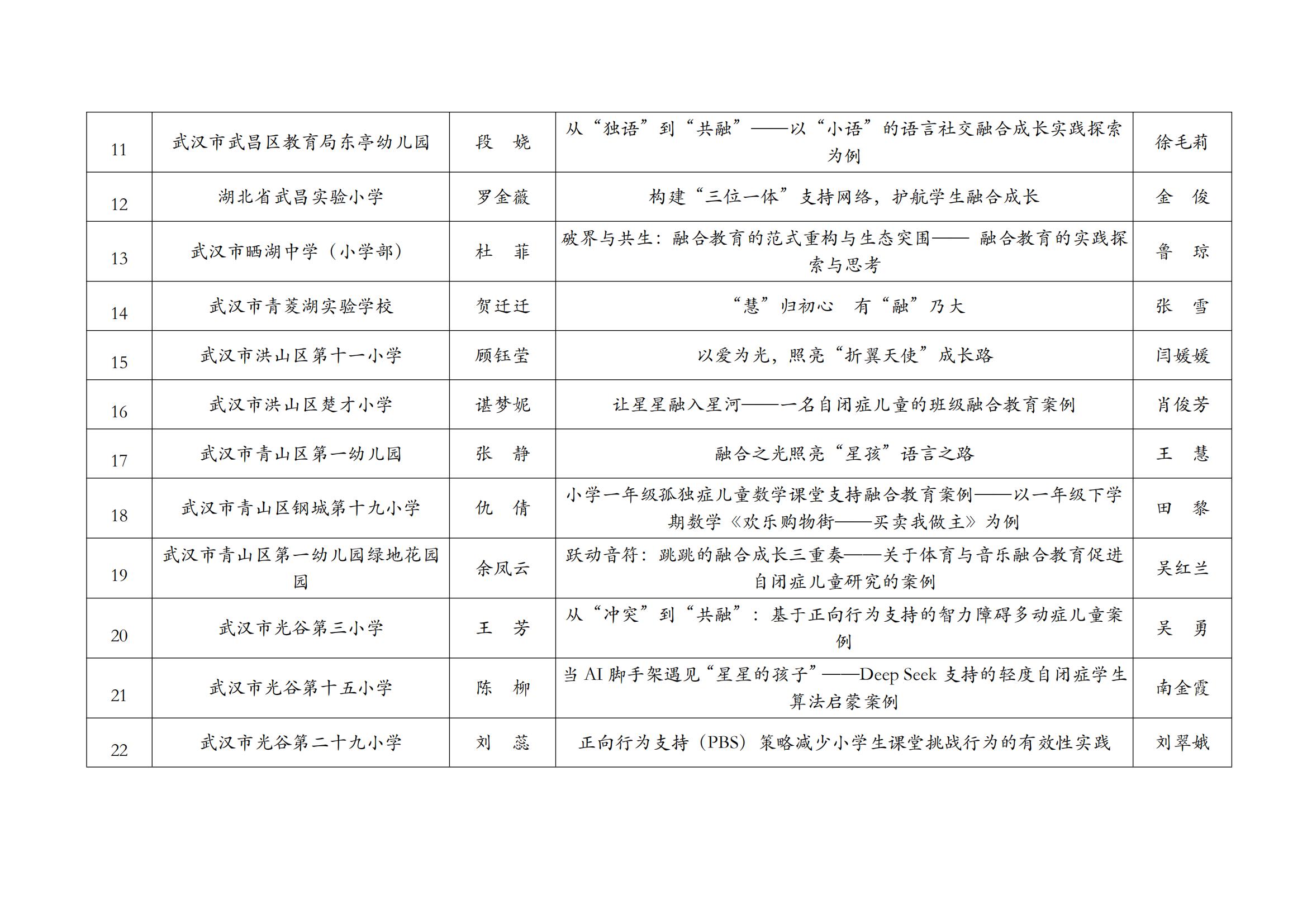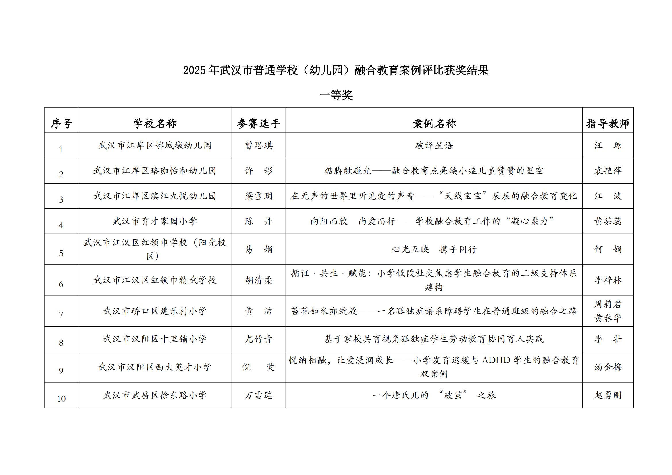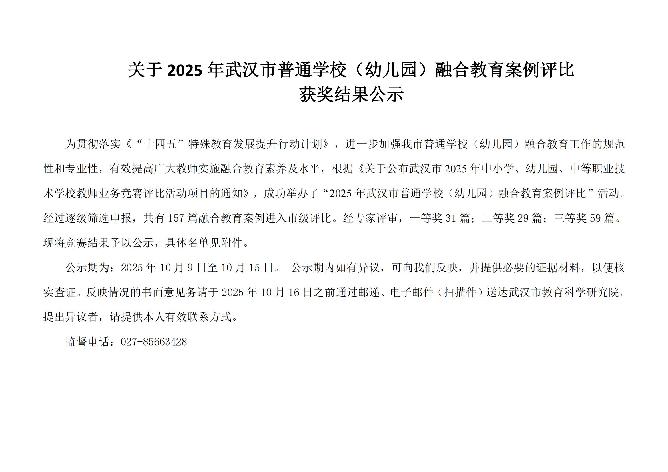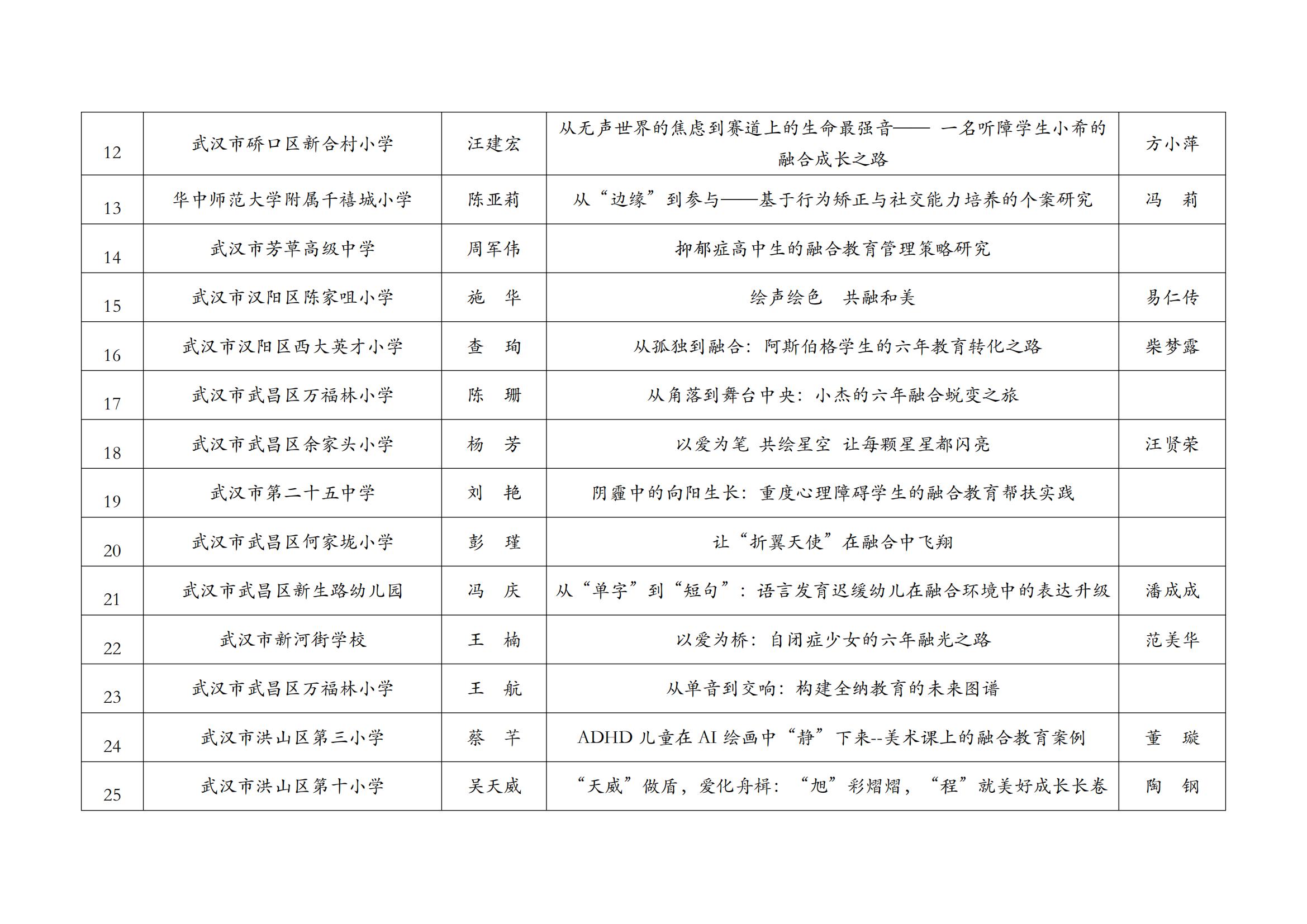 关于2025年武汉市普通学校(幼儿园)融合教育案例评比获奖结果公示