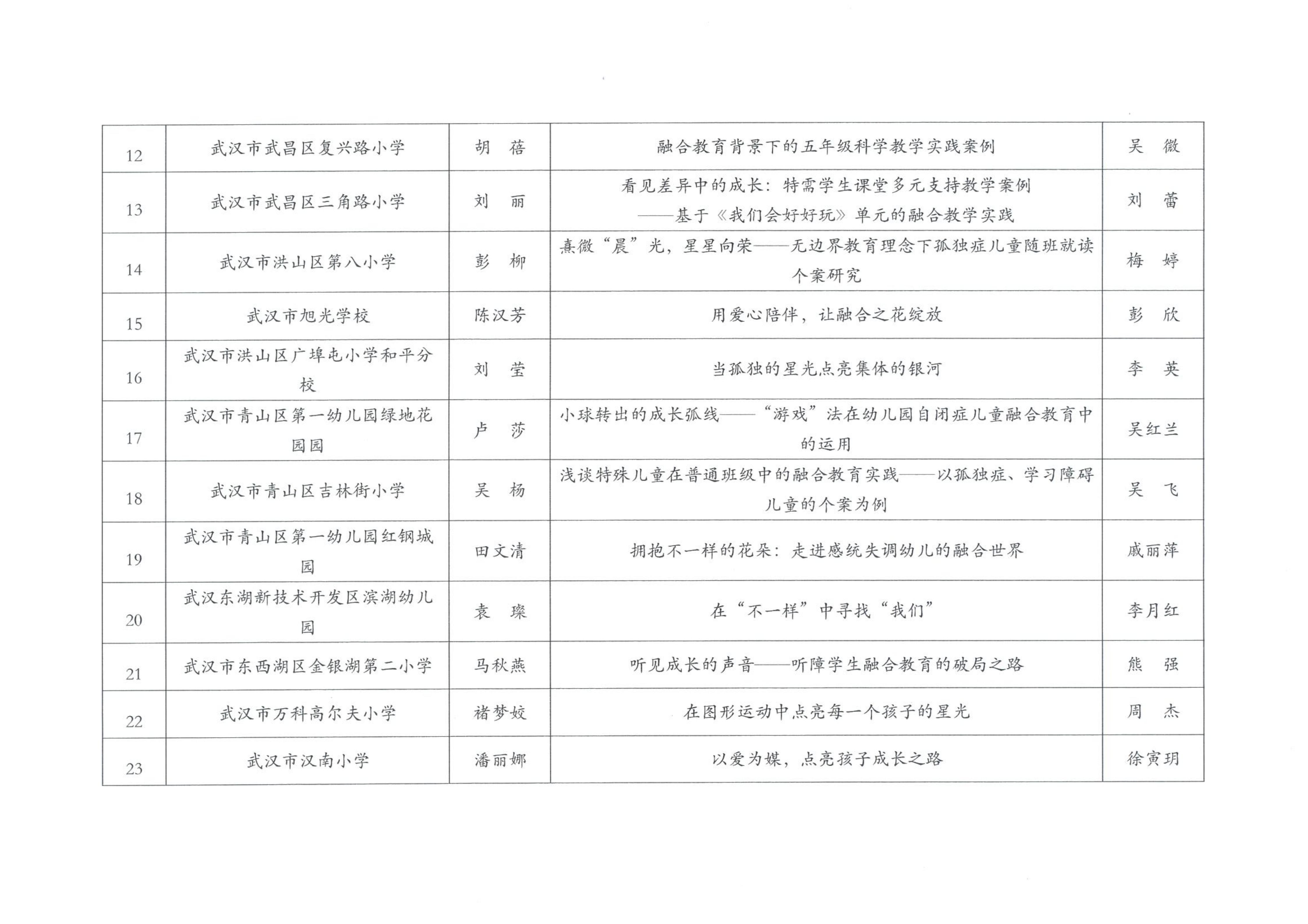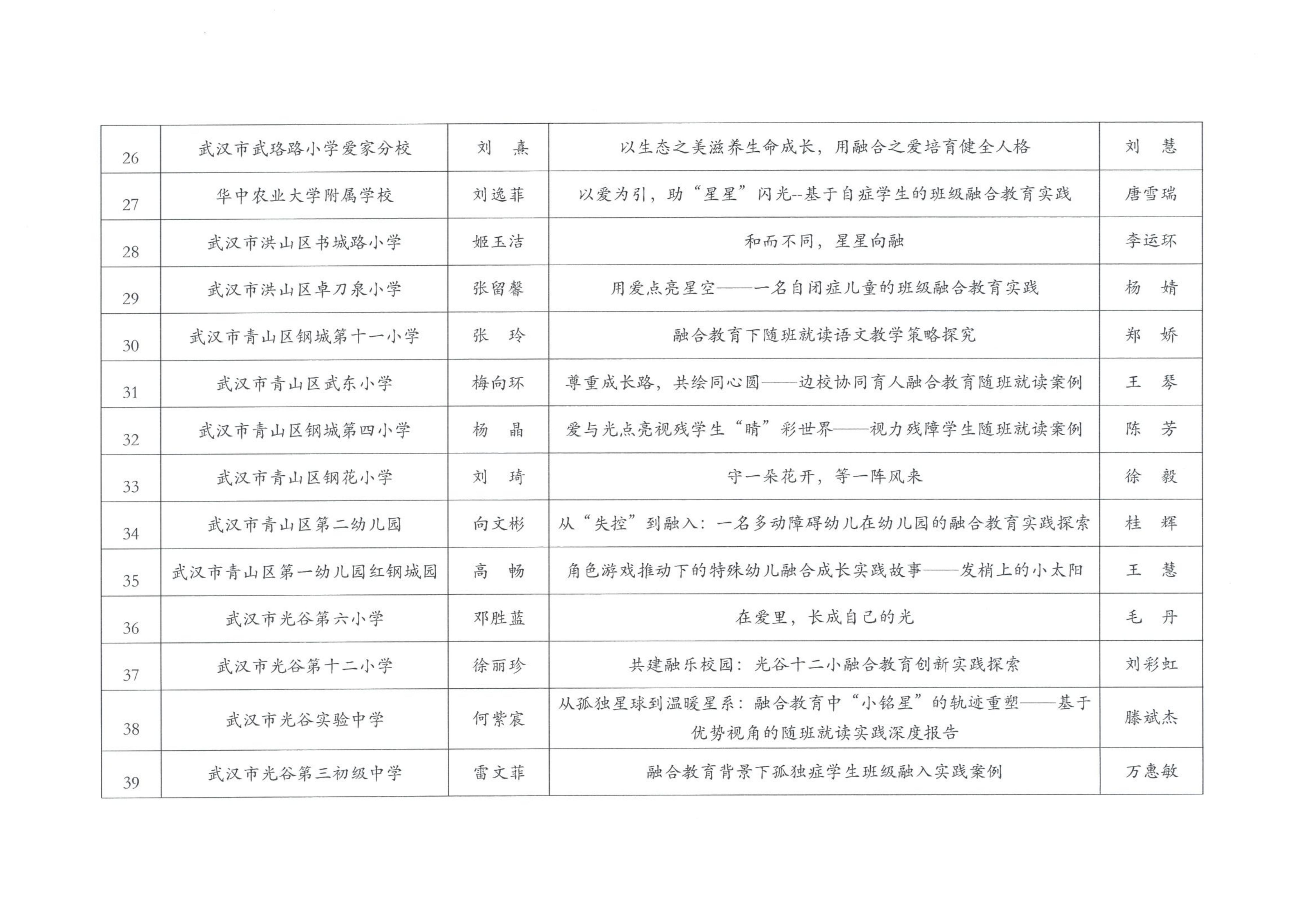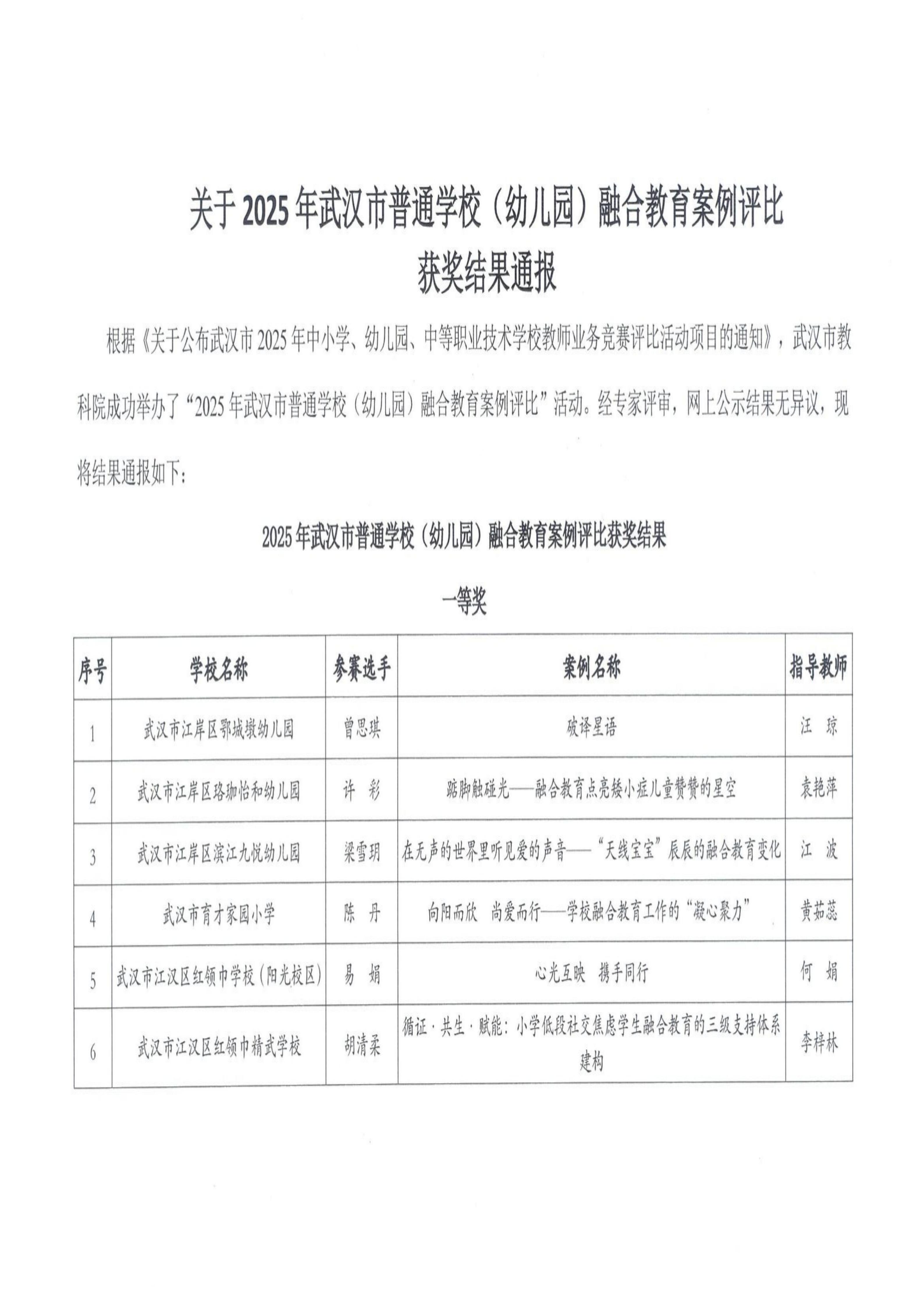 关于 2025年武汉市普通学校(幼儿园)融合教育案例评比获奖结果通报