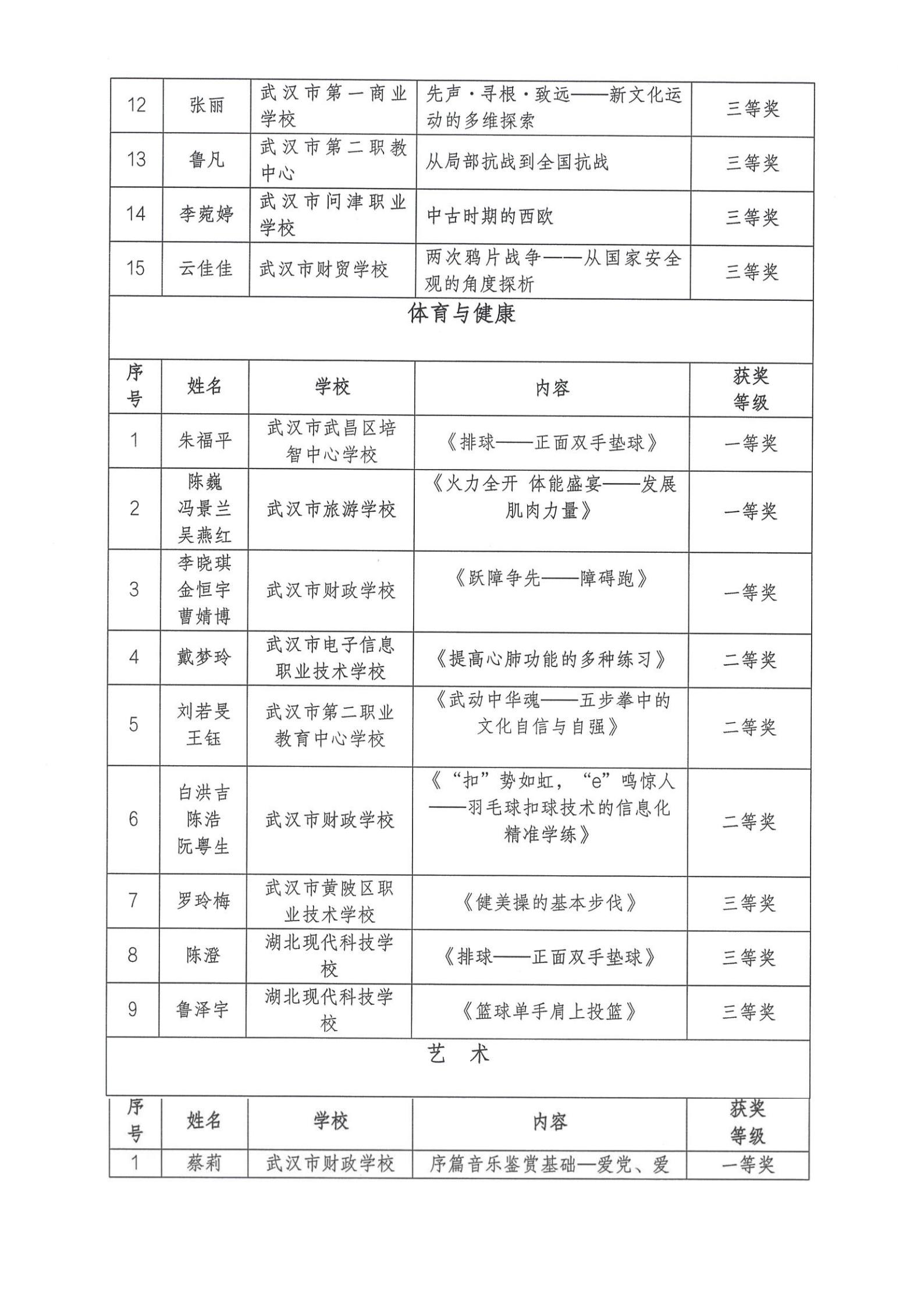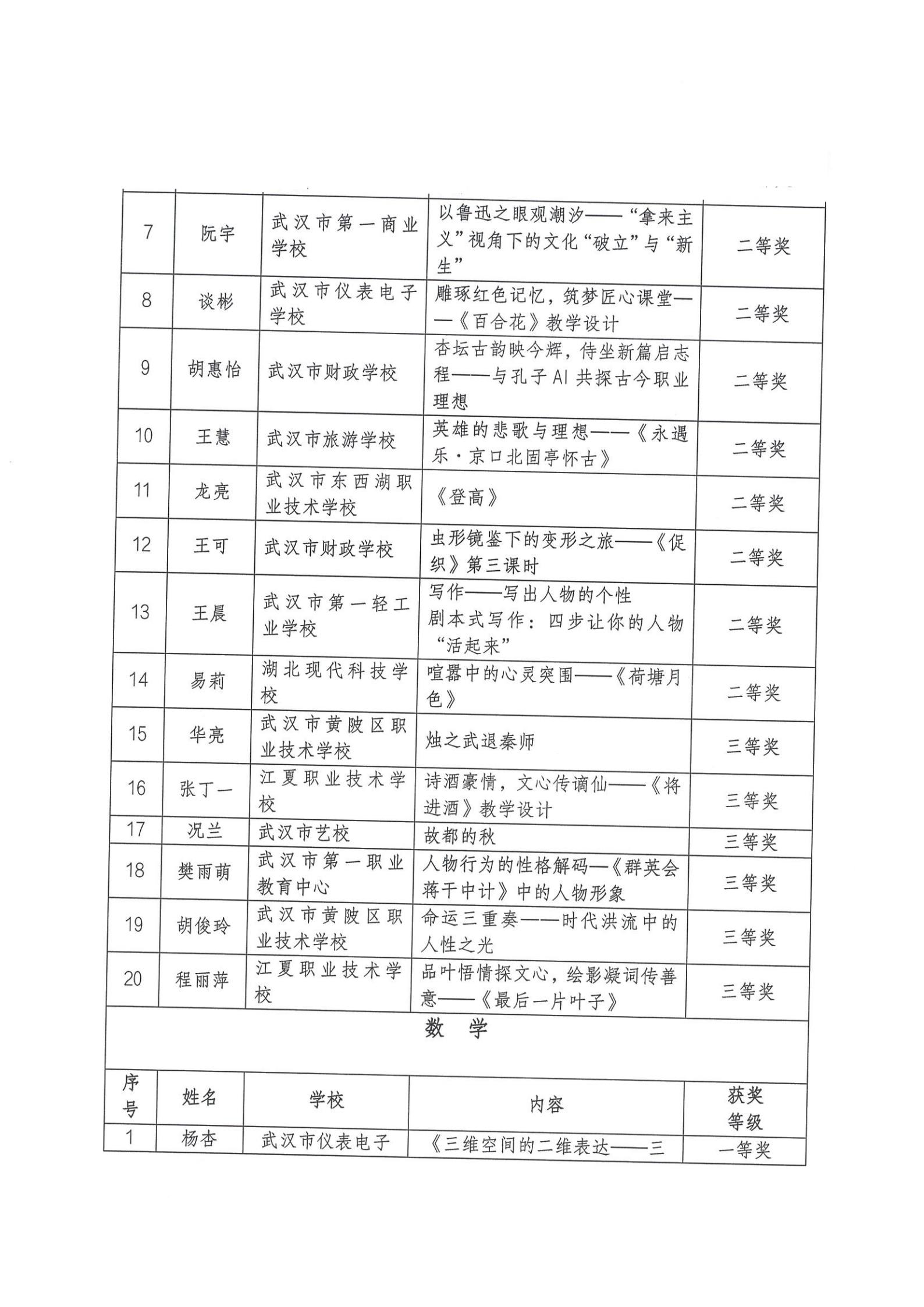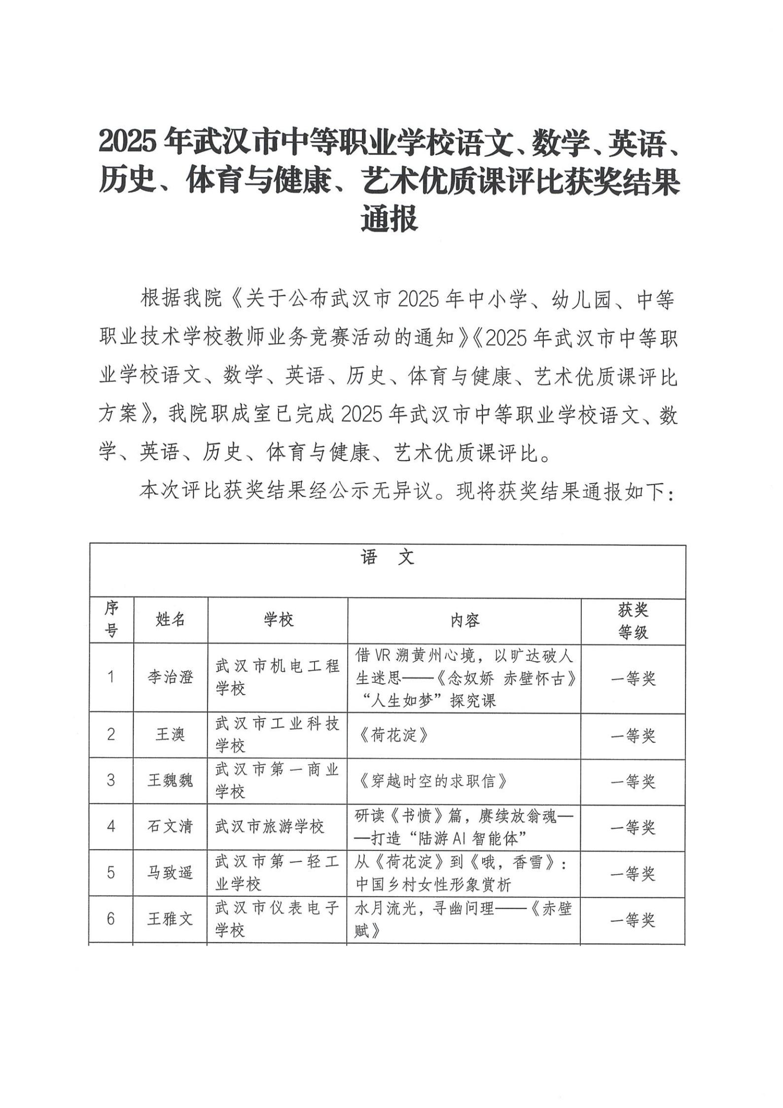 2025年武汉市中等职业学校语文、数学、英语、历史、体育与健康、艺术优质课评比获奖结果通报