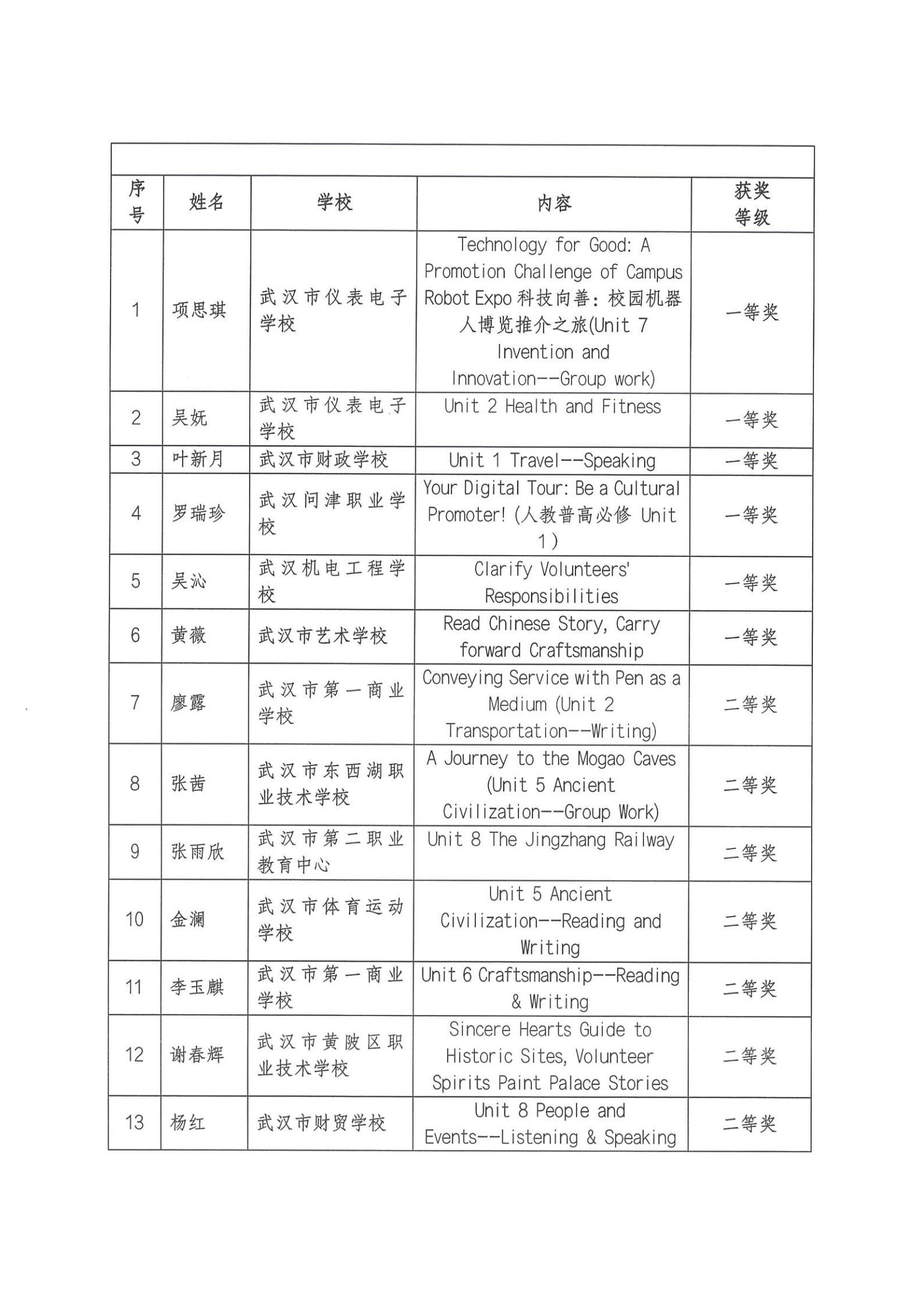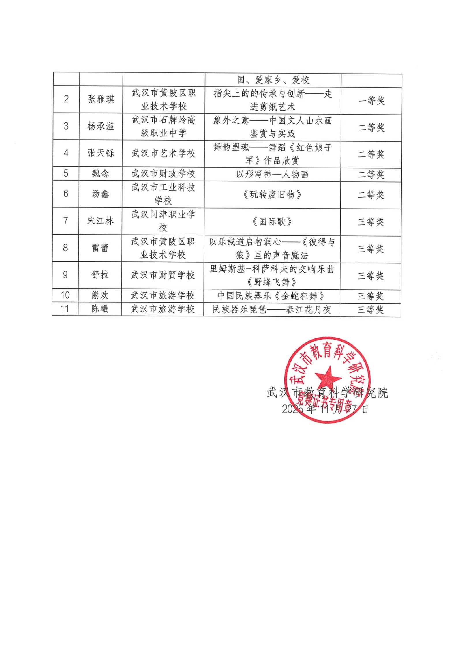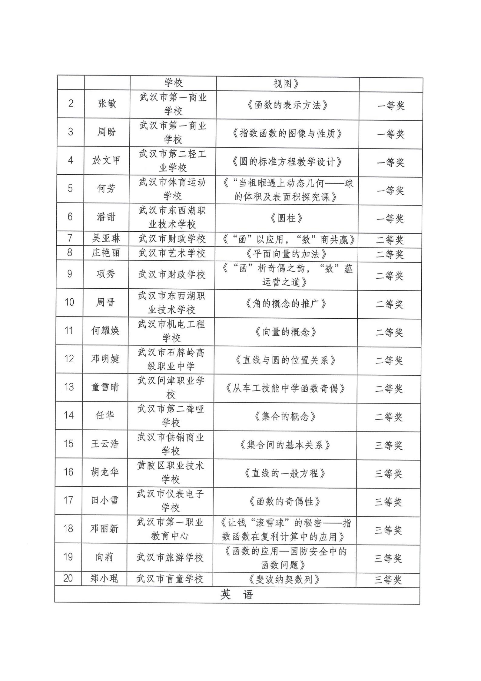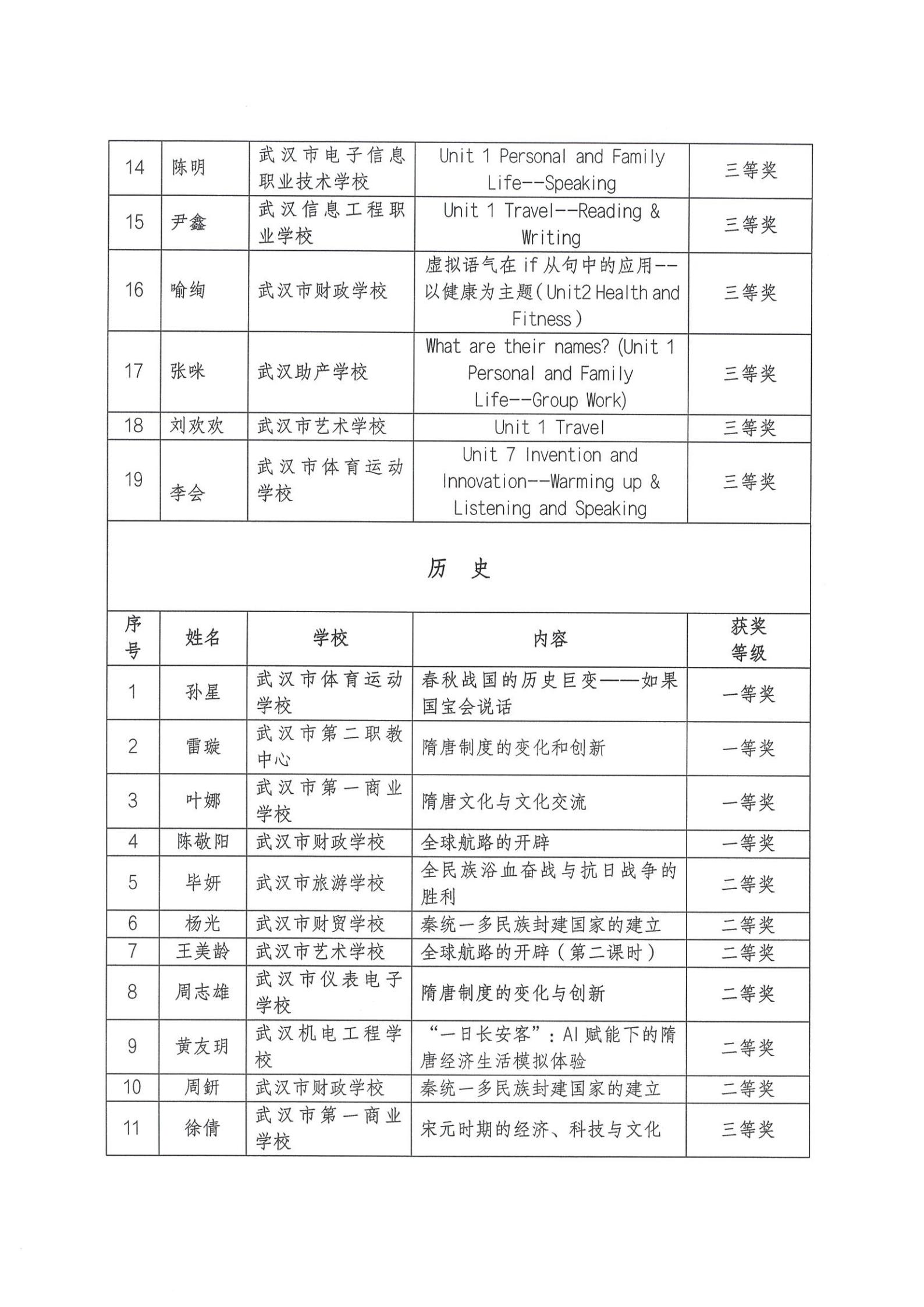 2025年武汉市中等职业学校语文、数学、英语、历史、体育与健康、艺术优质课评比获奖结果通报