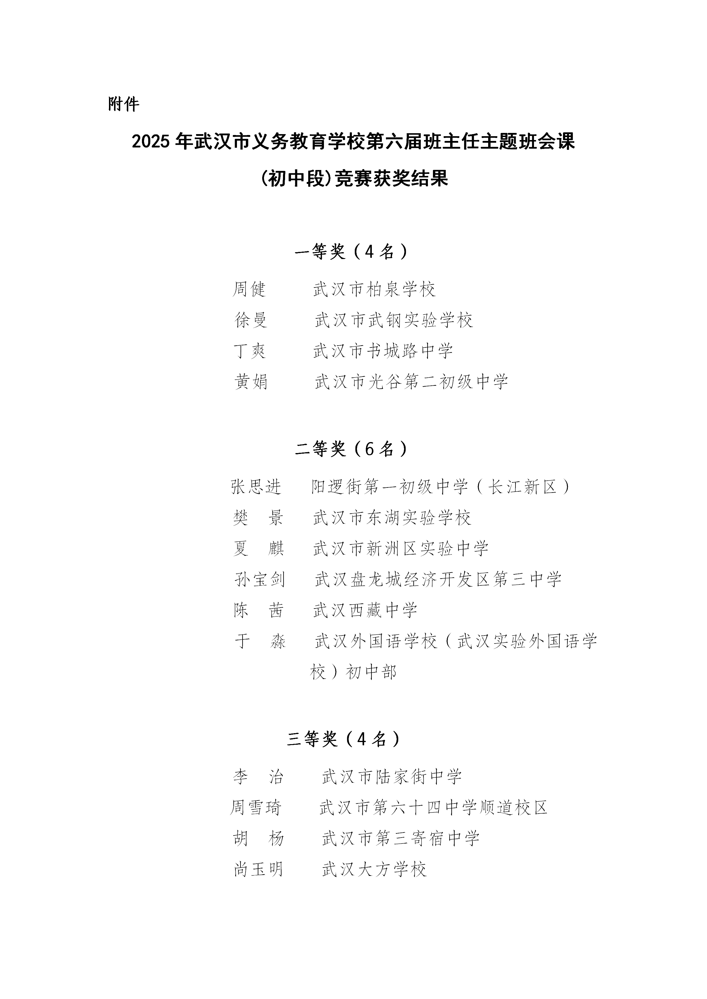 武汉市义务教育学校第六届班主任主题班会课(初中段)竞赛获奖结果公示