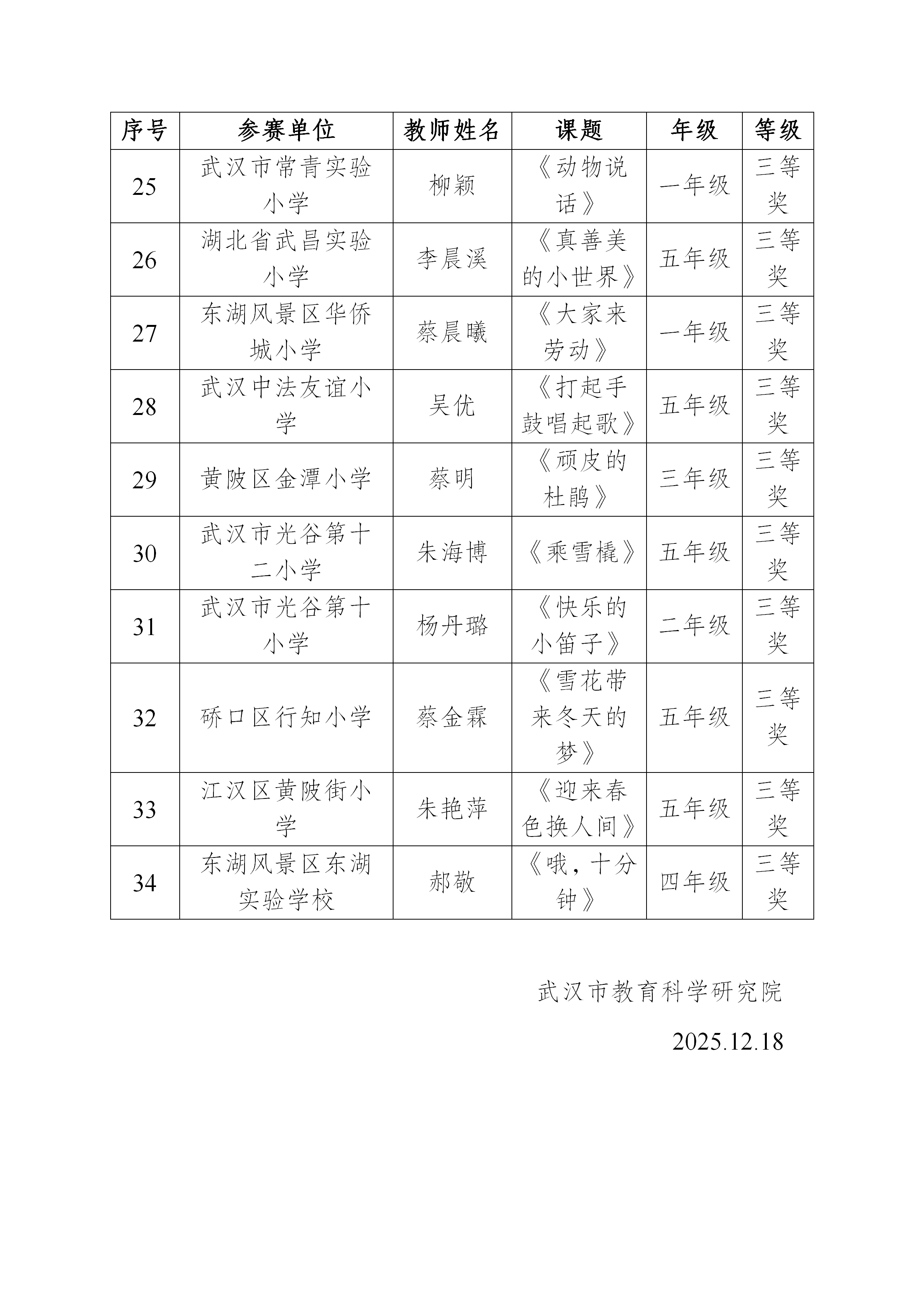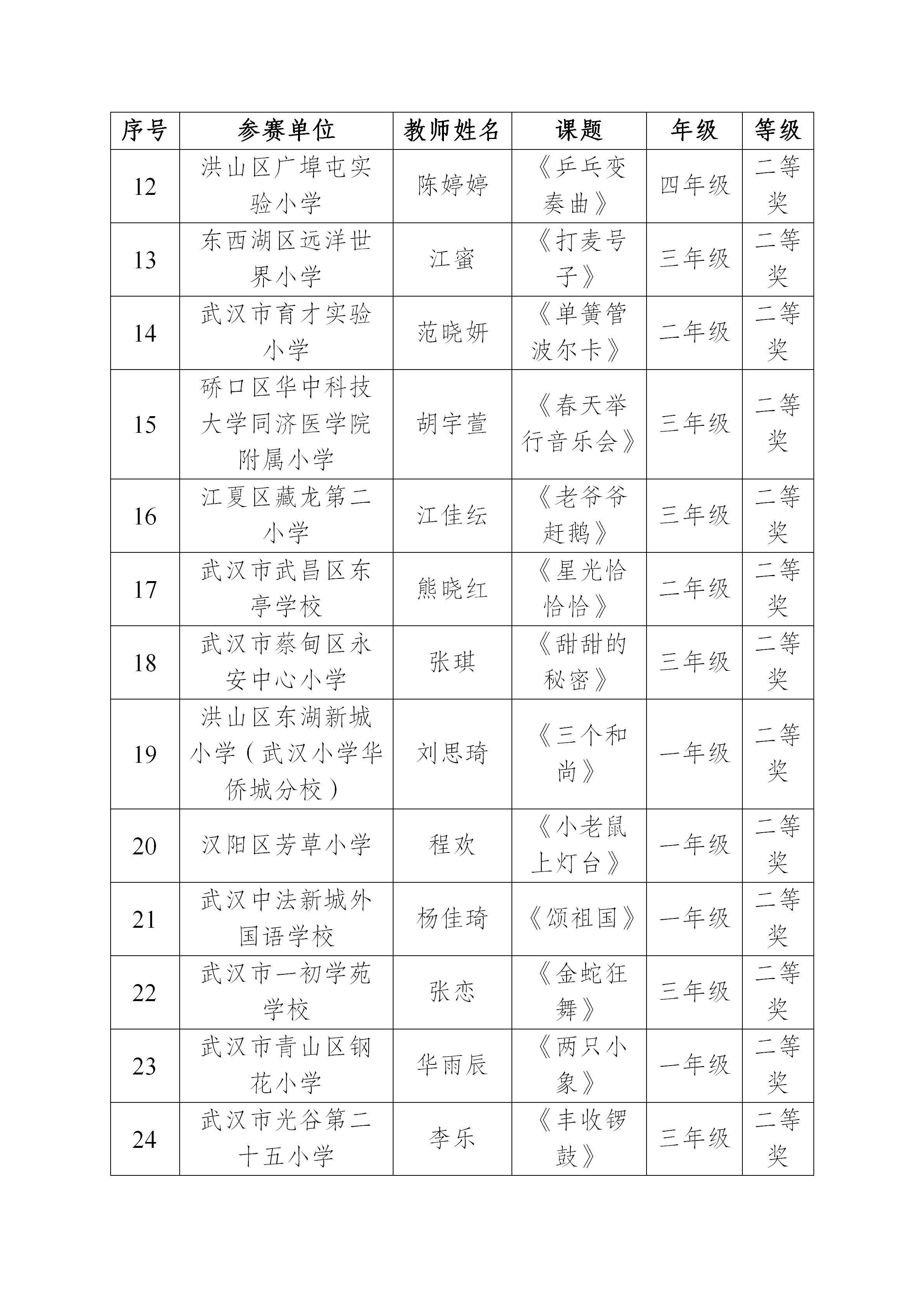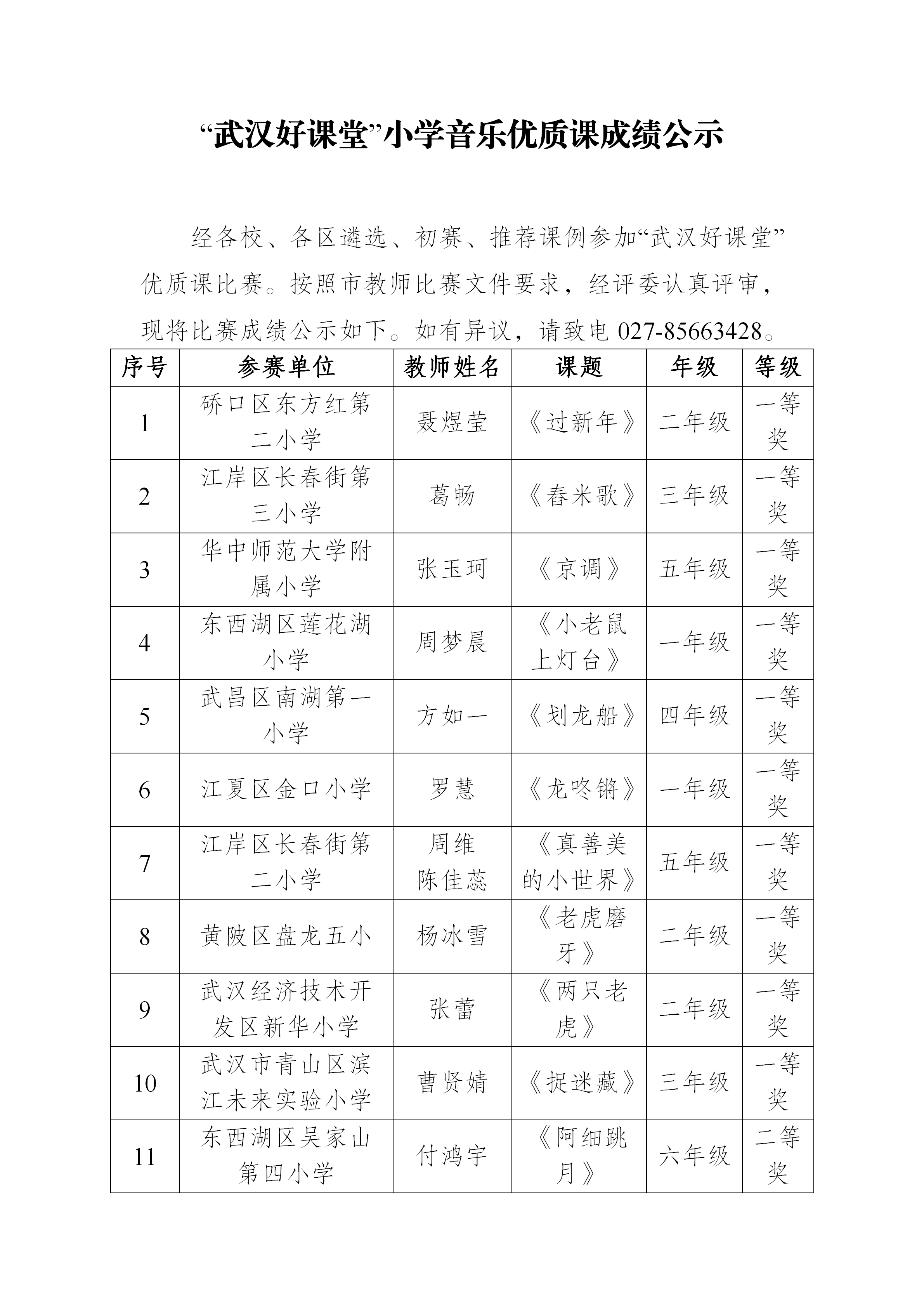 “武汉好课堂”小学音乐优质课成绩公示