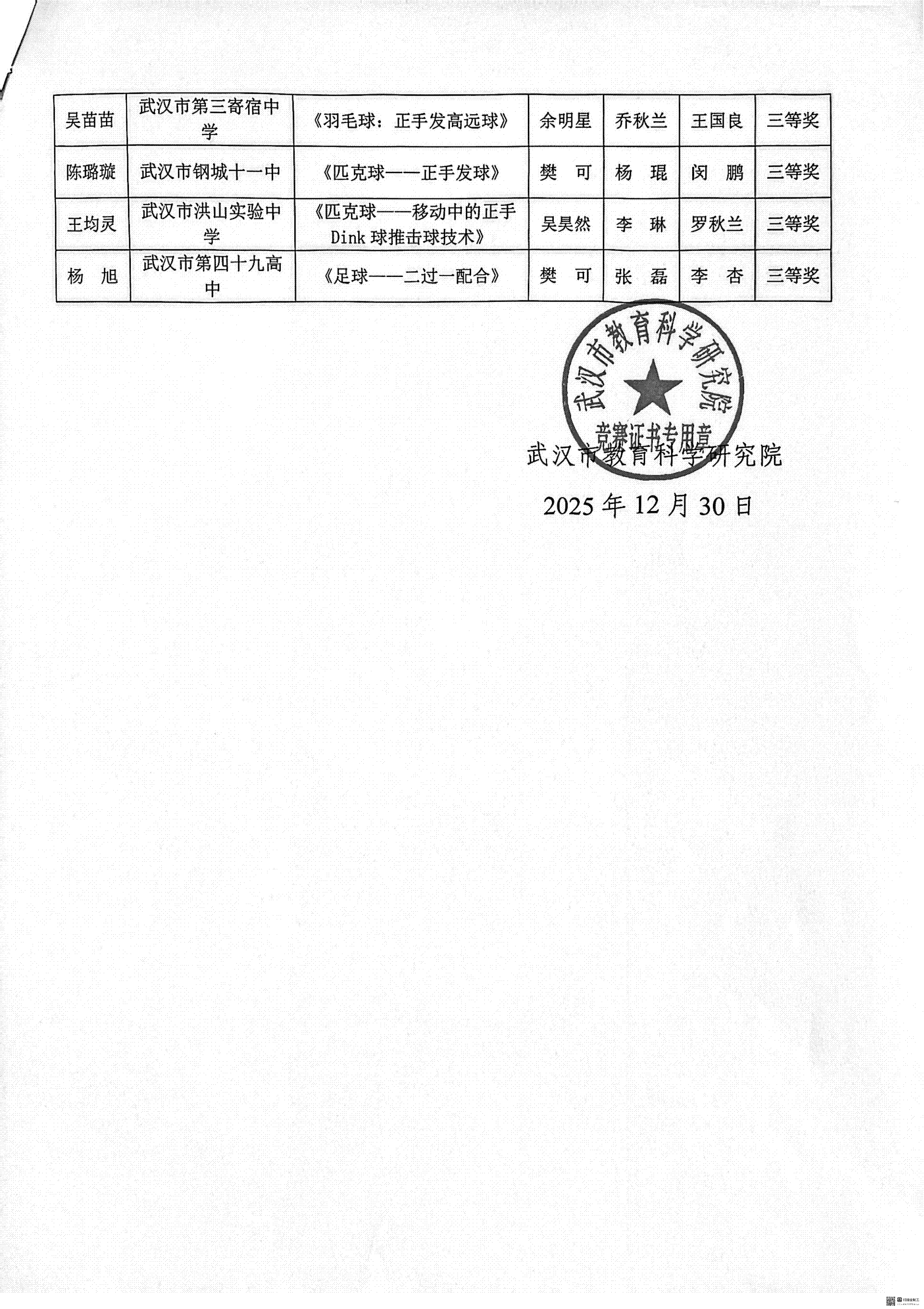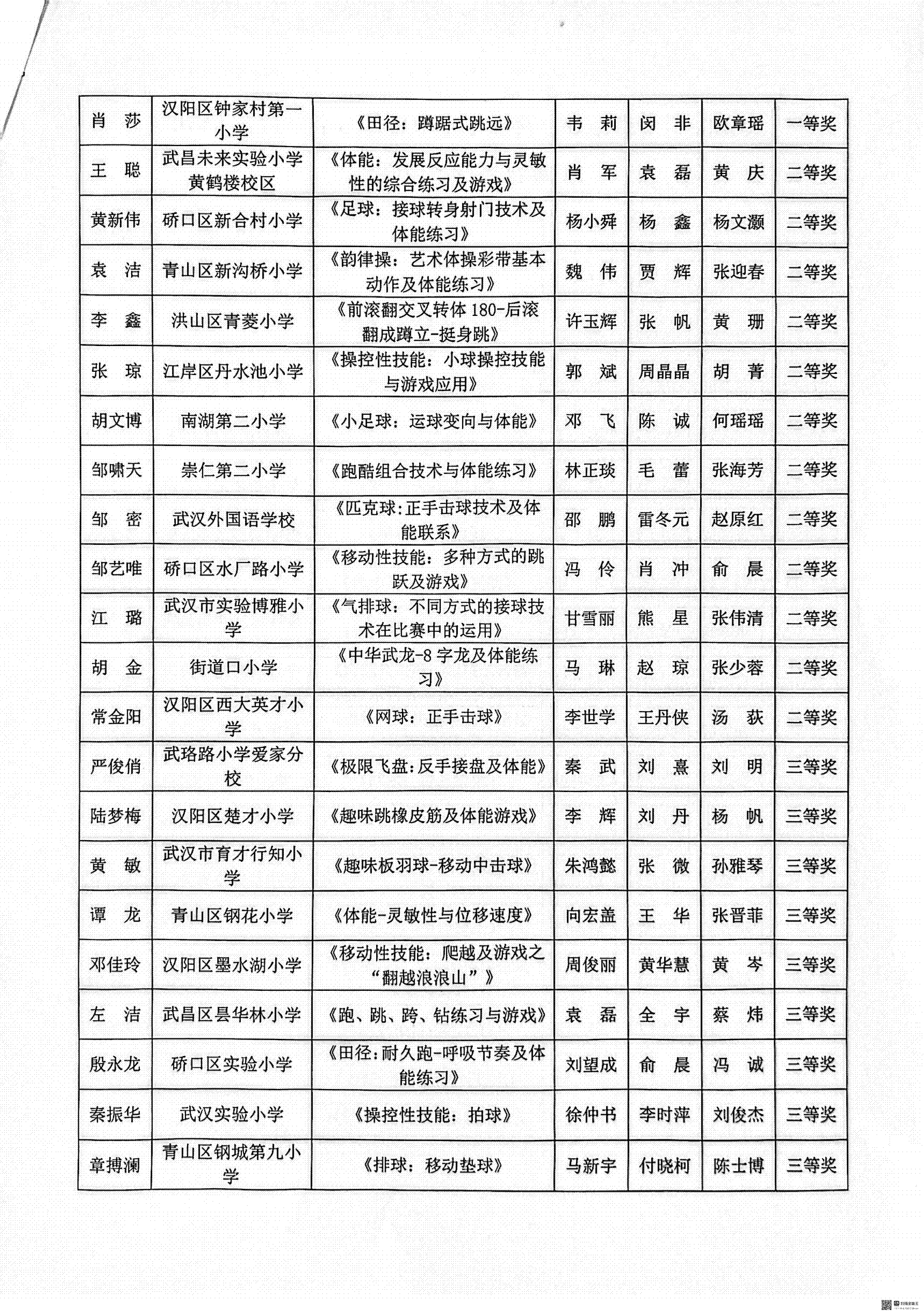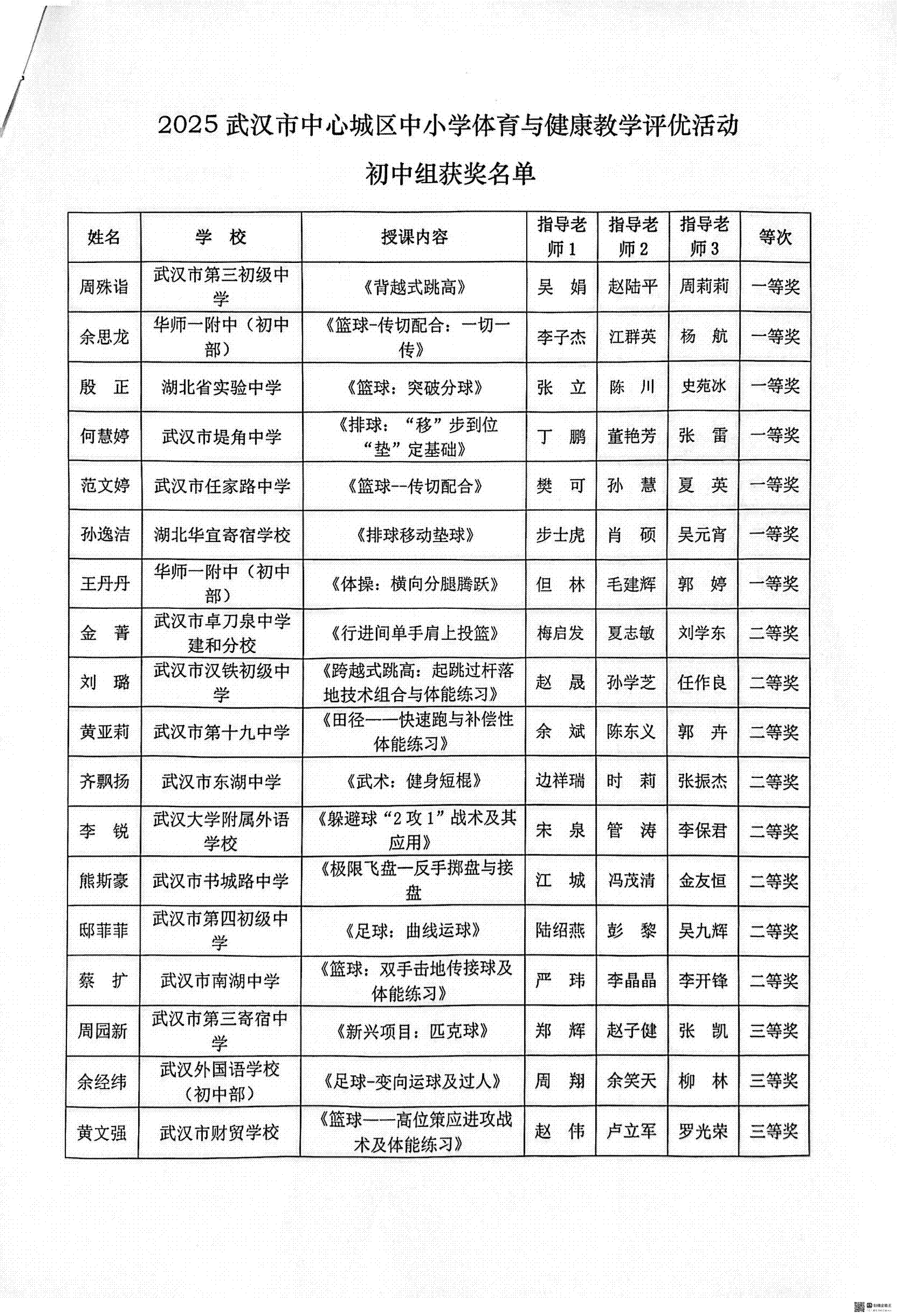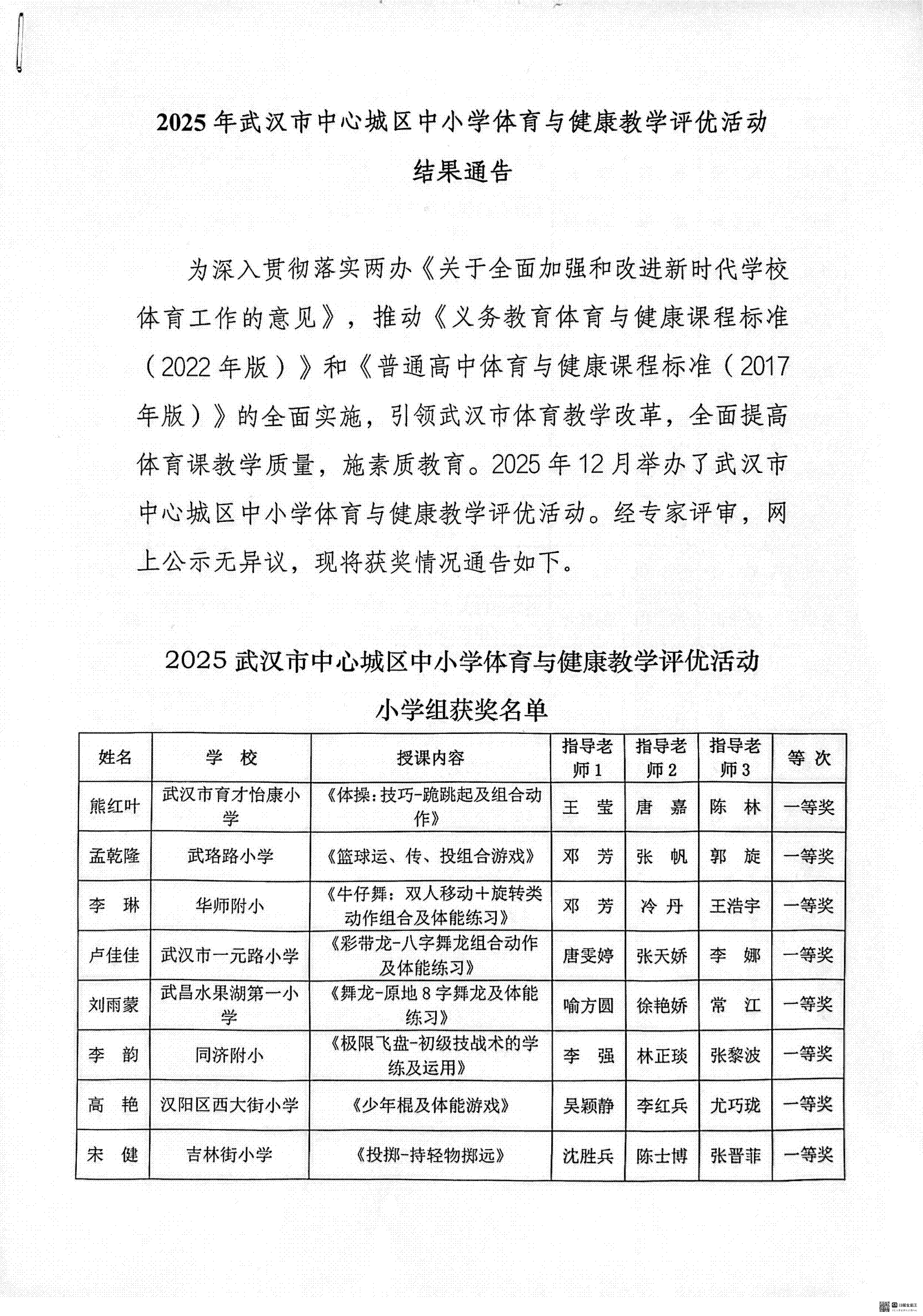 2025年武汉市中心城区中小学体育与健康教学评优活动结果通告