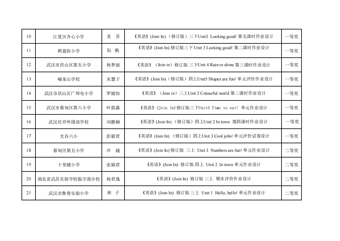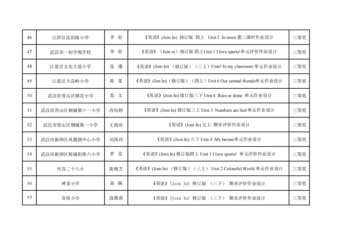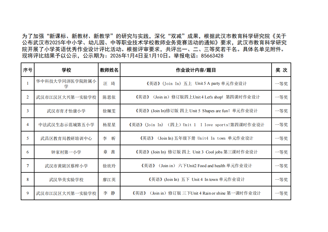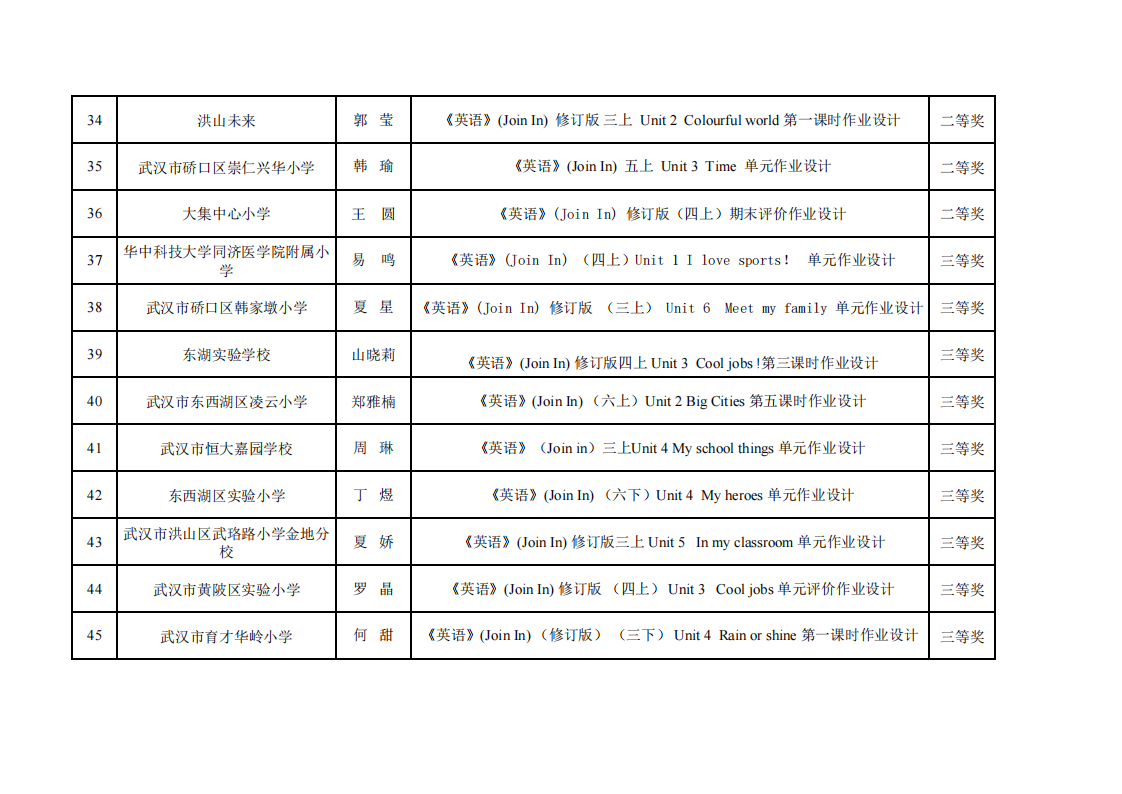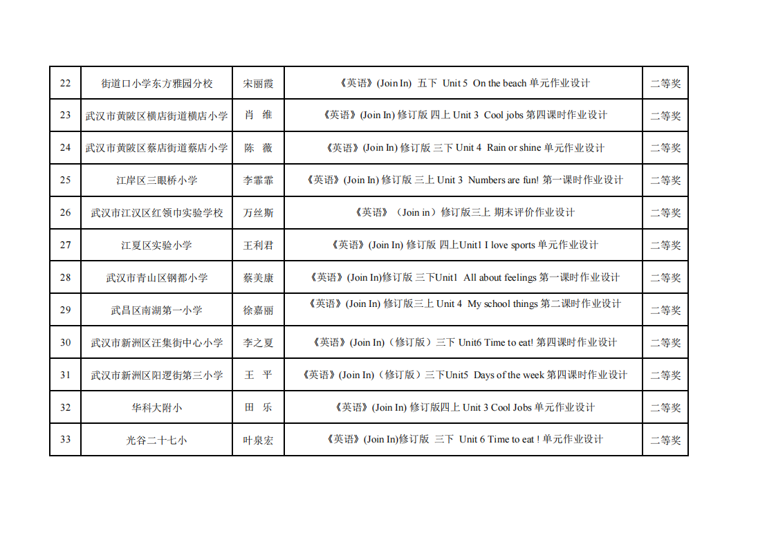 2025年武汉市小学英语优秀作业设计评比结果公示