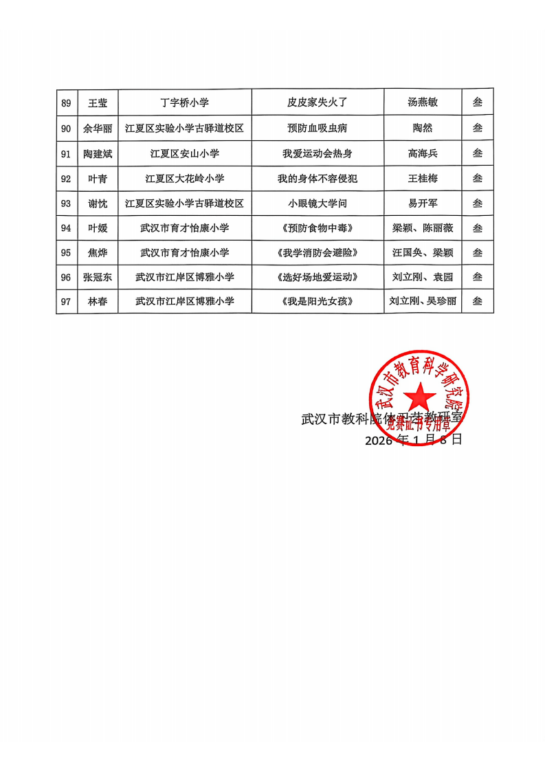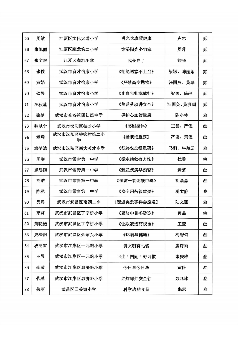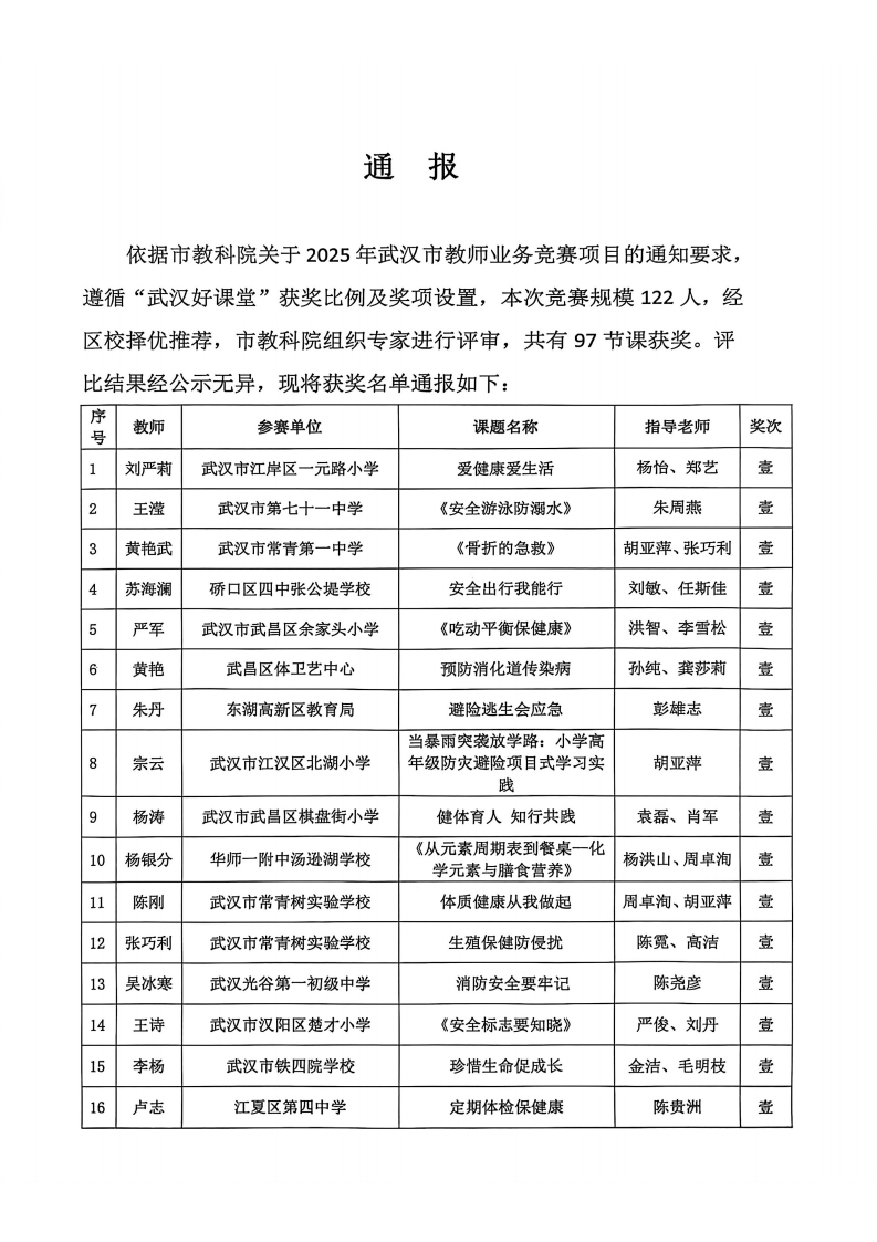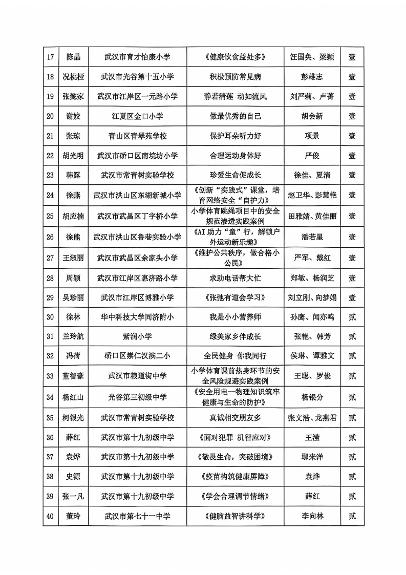 武汉好课堂”2025年武汉市中小学生命安全与健康教育跨学科融合教学优课获奖名单通报
