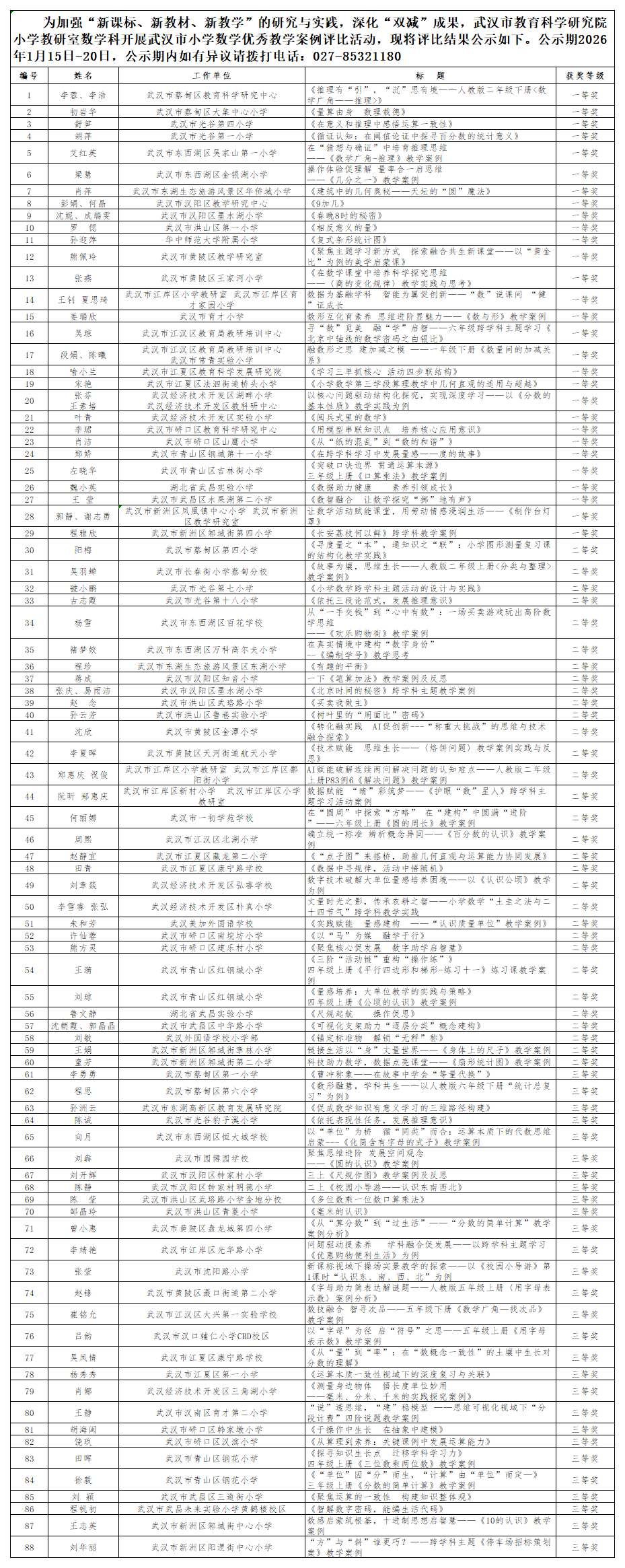 武汉市2025年小学数学优秀教学案例评比获奖名单公示