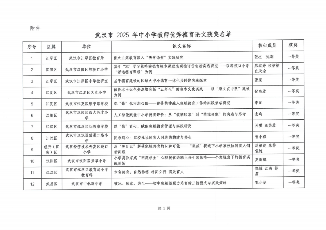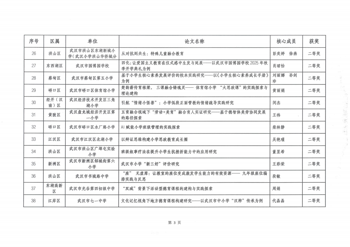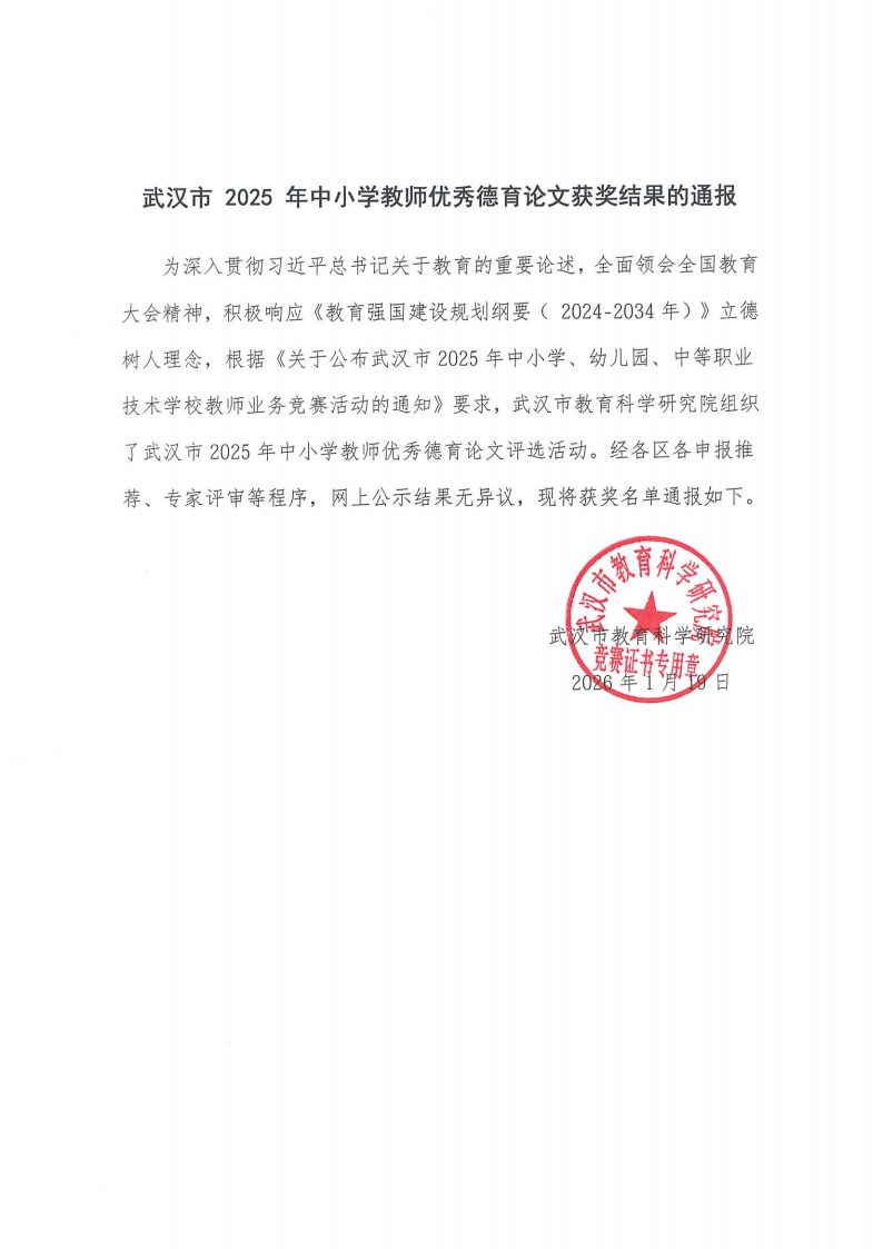 武汉市2025年中小学教师优秀道德论文获奖结果的通报