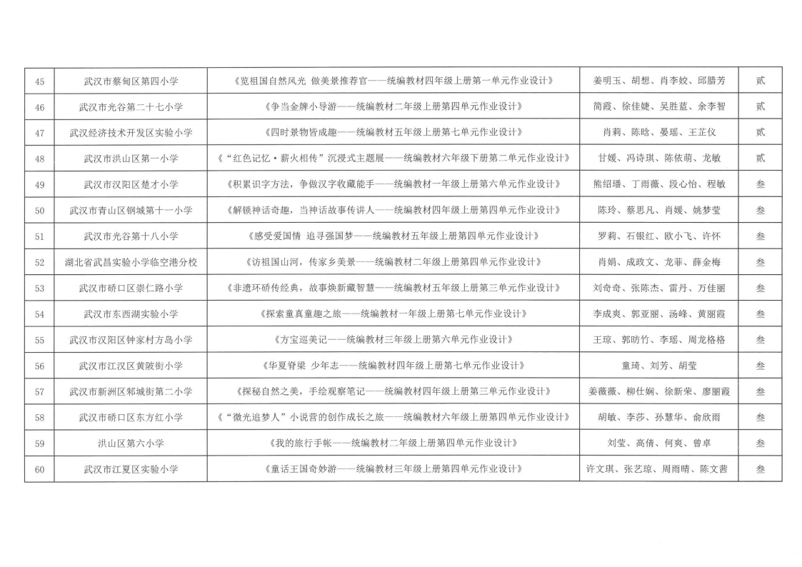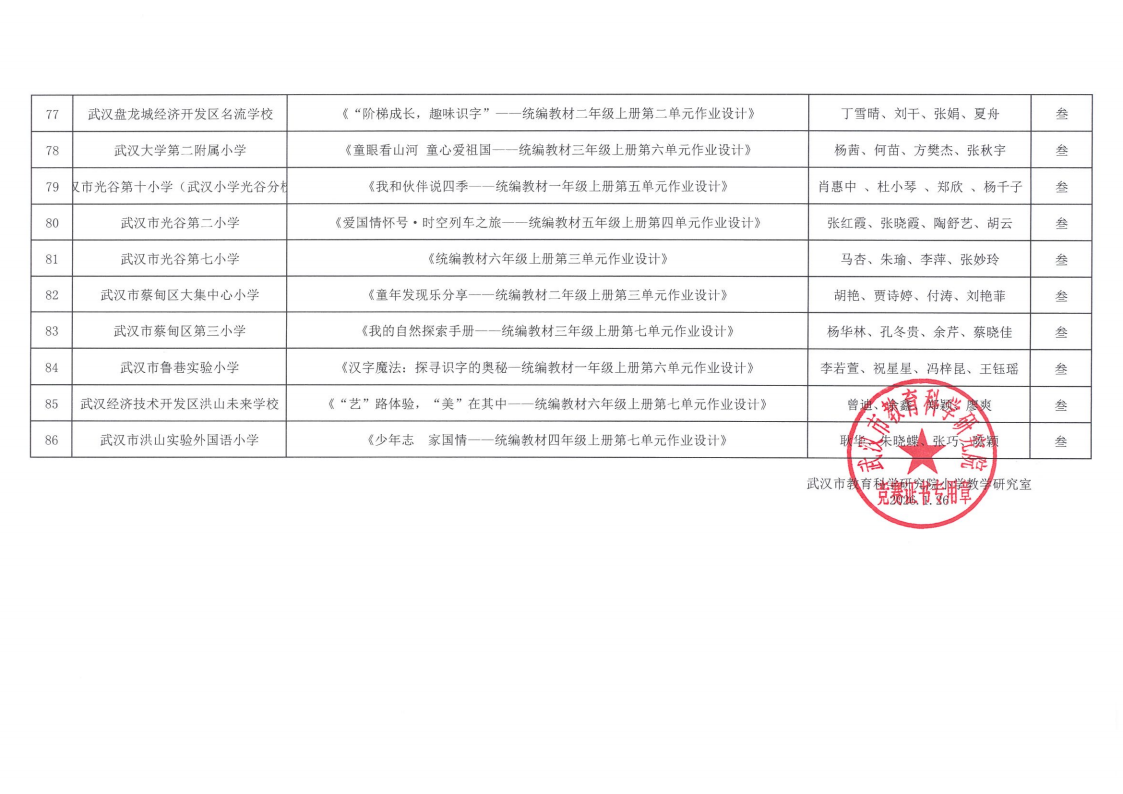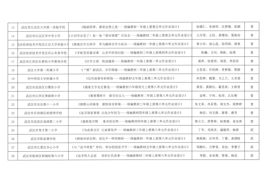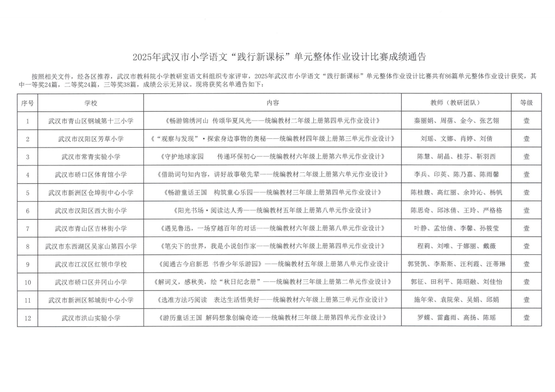 2025年武汉市小学语文“践行新课标”单元整体作业设计比赛成绩通告