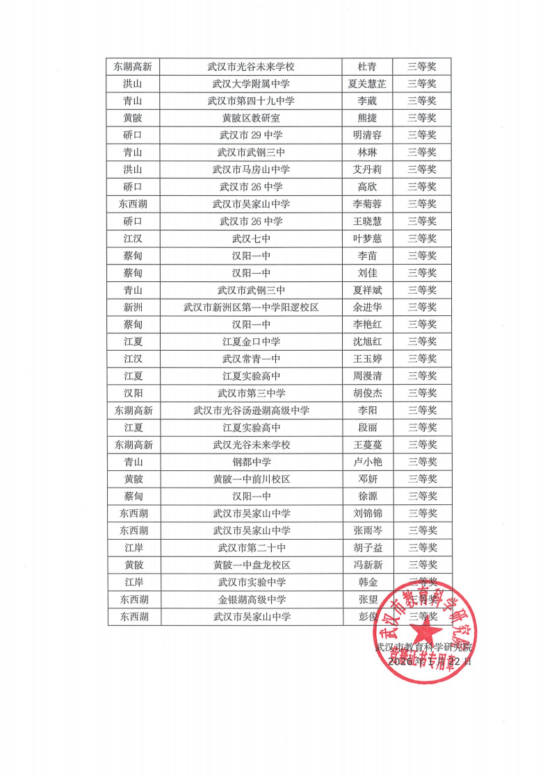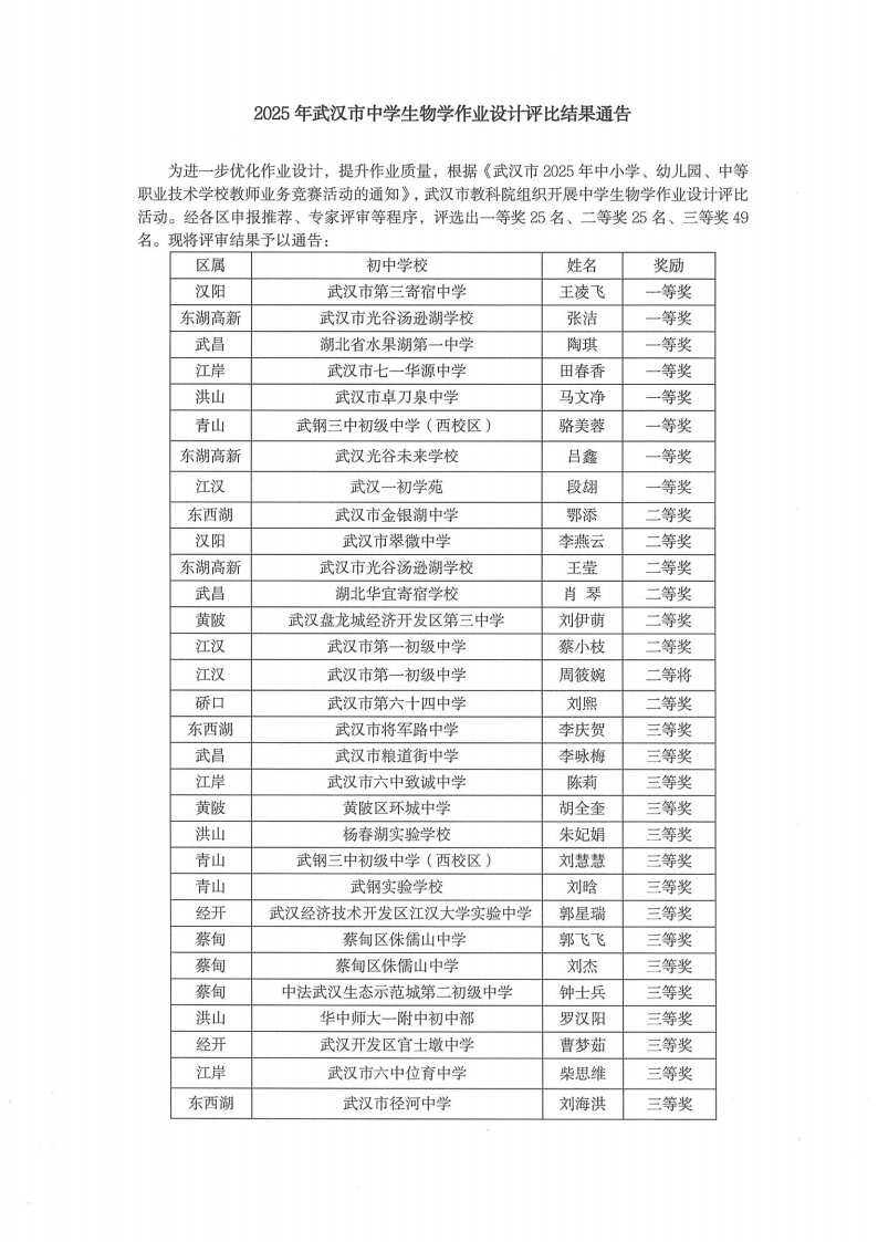 2025年武汉市中学生物作业设计评比结果通告