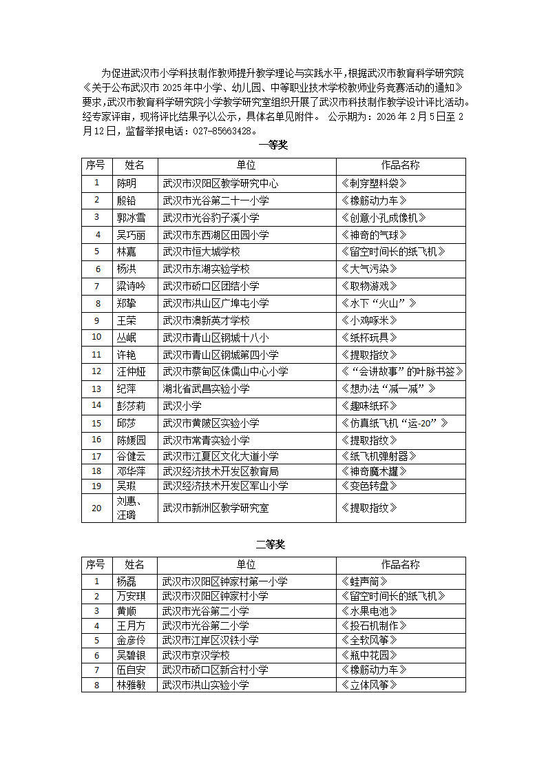 2025年“武汉好教研”小学科技制作教学设计评比结果公示
