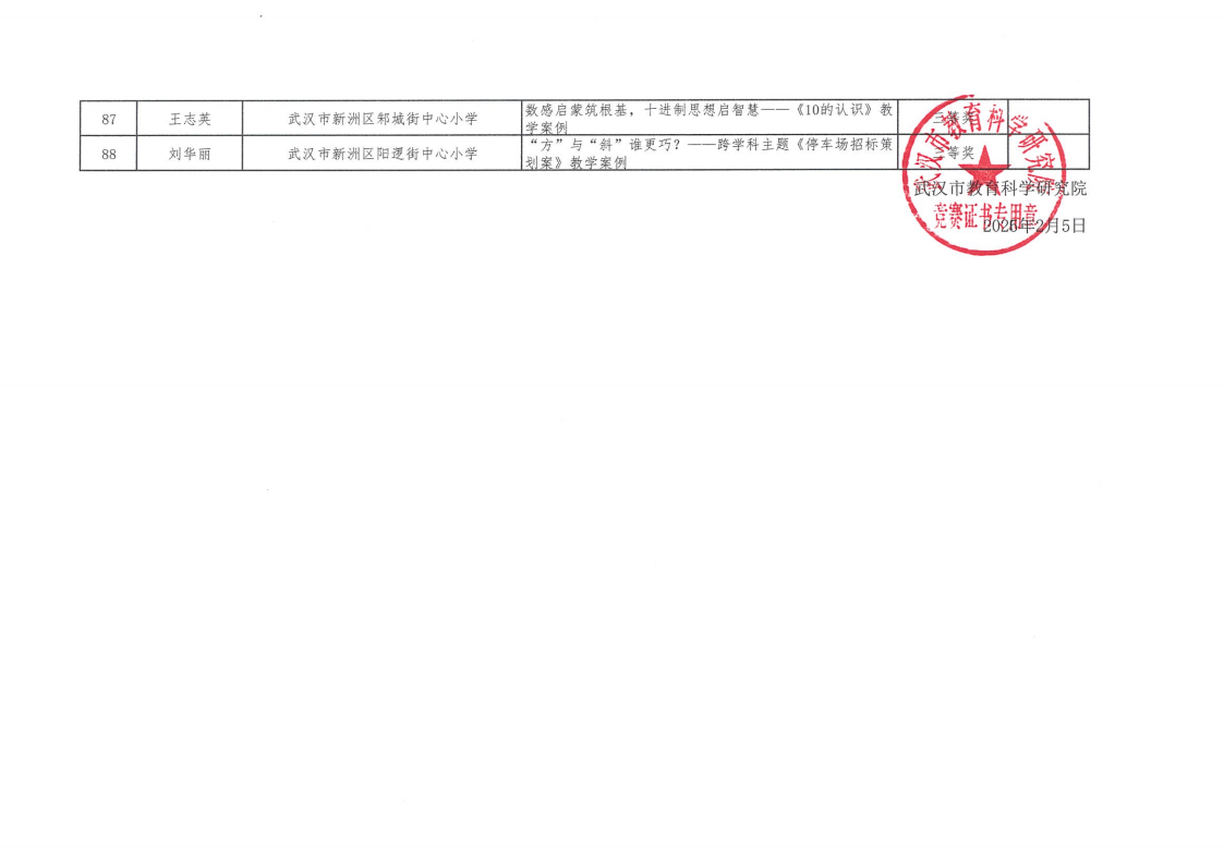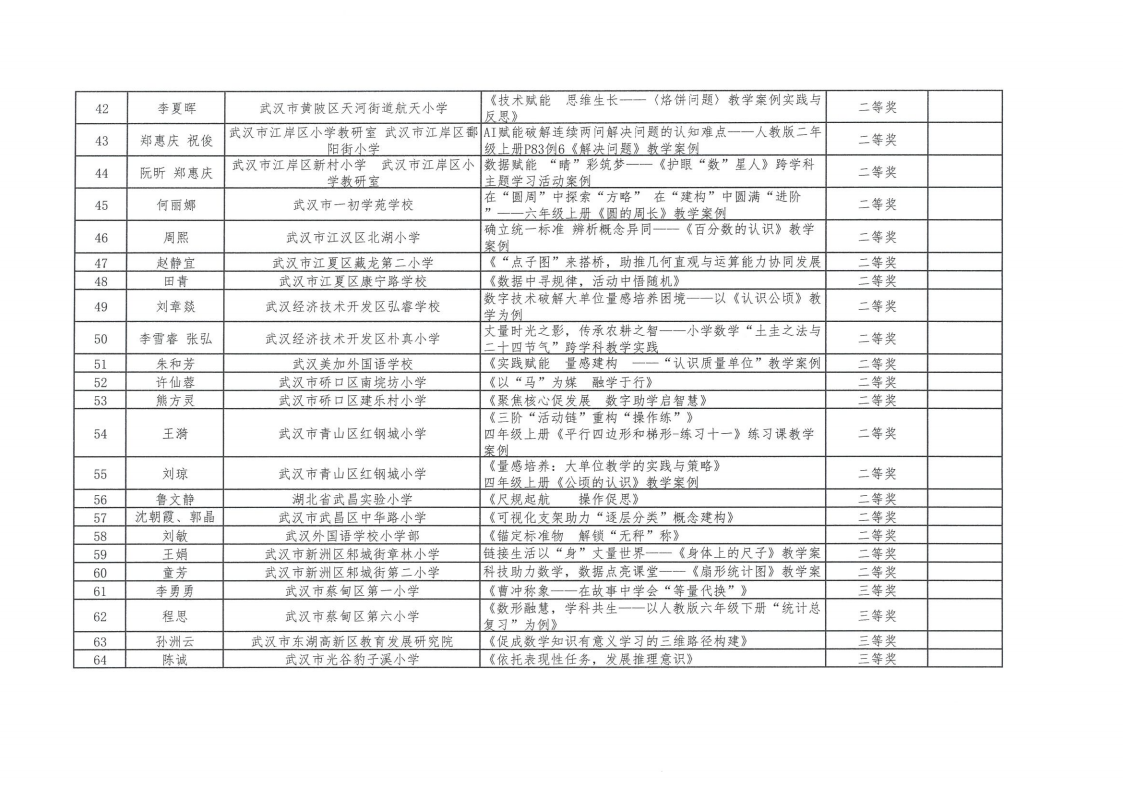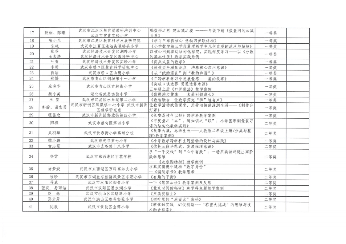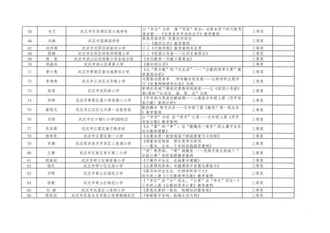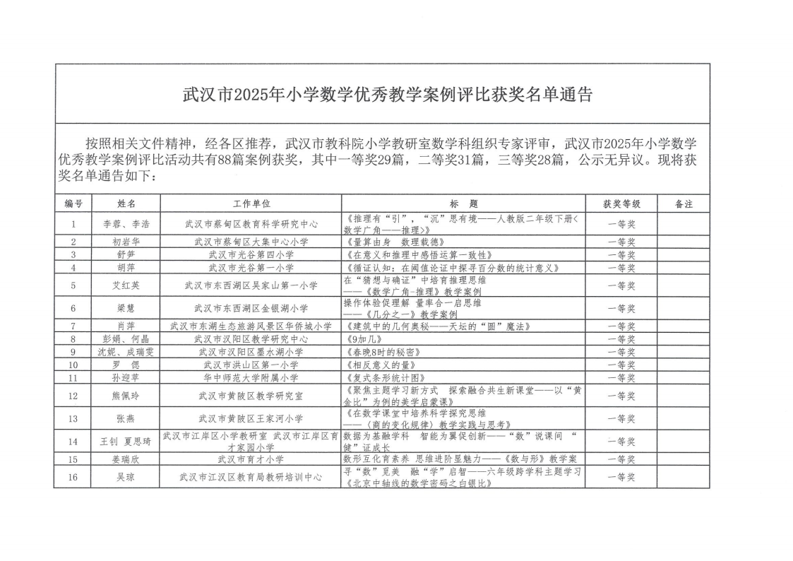 武汉市2025年小学数学优秀教学案例评比获奖名单通告